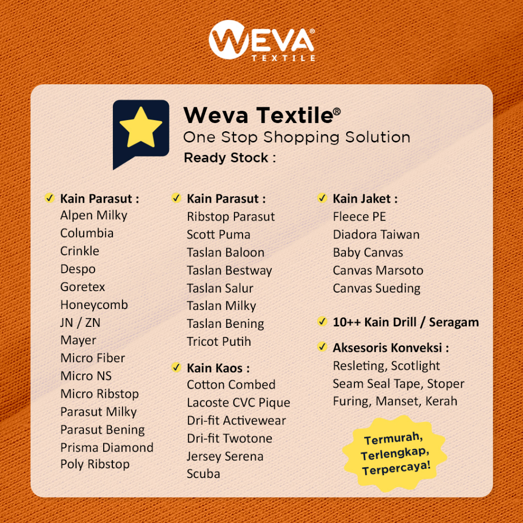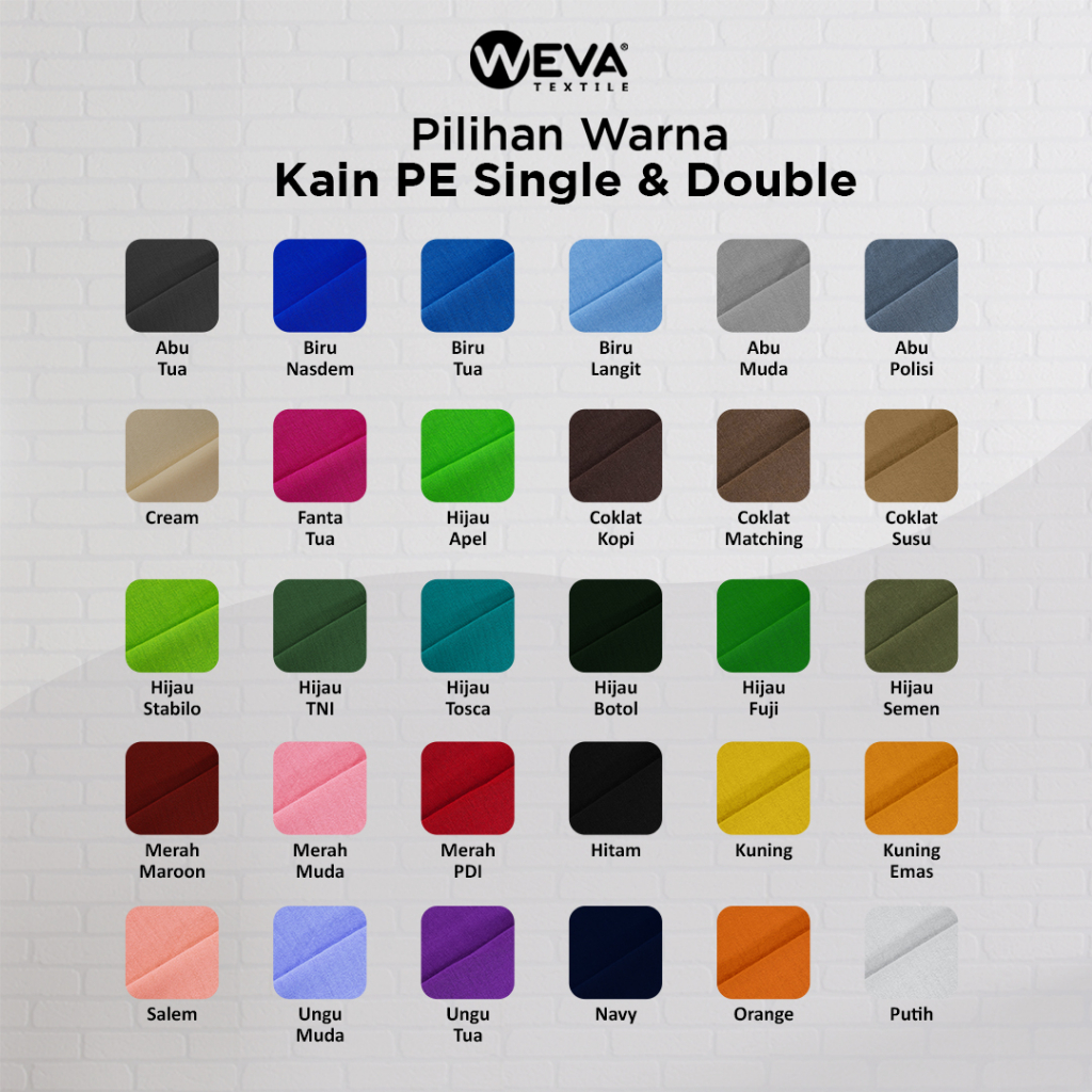 Abu Muda, Abu Polisi, Abu Tua, Biru Langit, Biru Nasdem, Biru Tua, Coklat Kopi, Coklat Matching, Coklat-Susu, Cream, Fanta Tua, Hijau Apel, Hijau Fuji, Hijau Semen, Hijau Stabilo, Hijau Tua, Hijau Tosca, Hijau-Botol, Hitam, Kuning Emas, Kuning Kenari, Merah Maroon, Merah Muda, Merah PDI, Navy, Orange, Putih, Salem, Ungu Muda, Ungu Tua