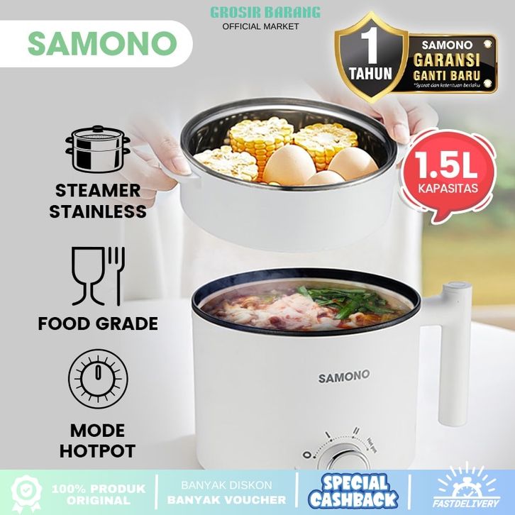 Panci Listrik Multifungsi Samono Kukusan Tutup Kaca 1.5 Liter Stainless Steamer 150 Watt