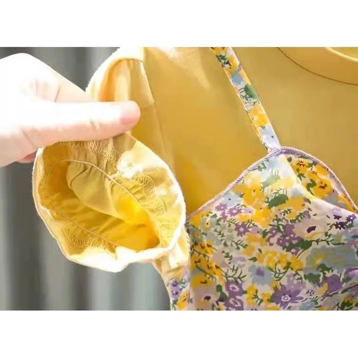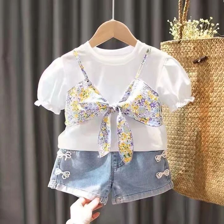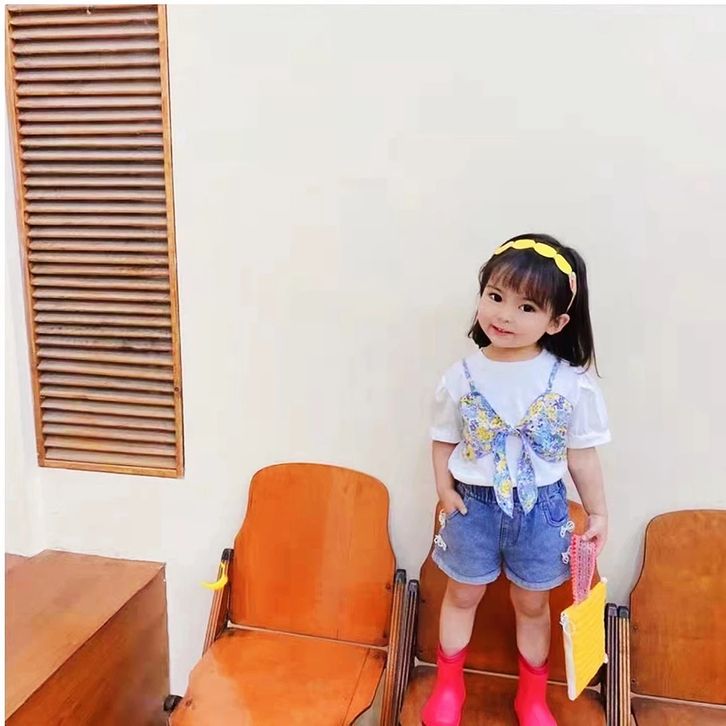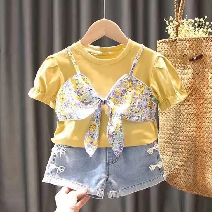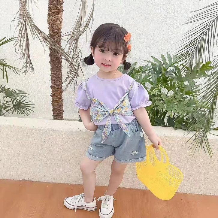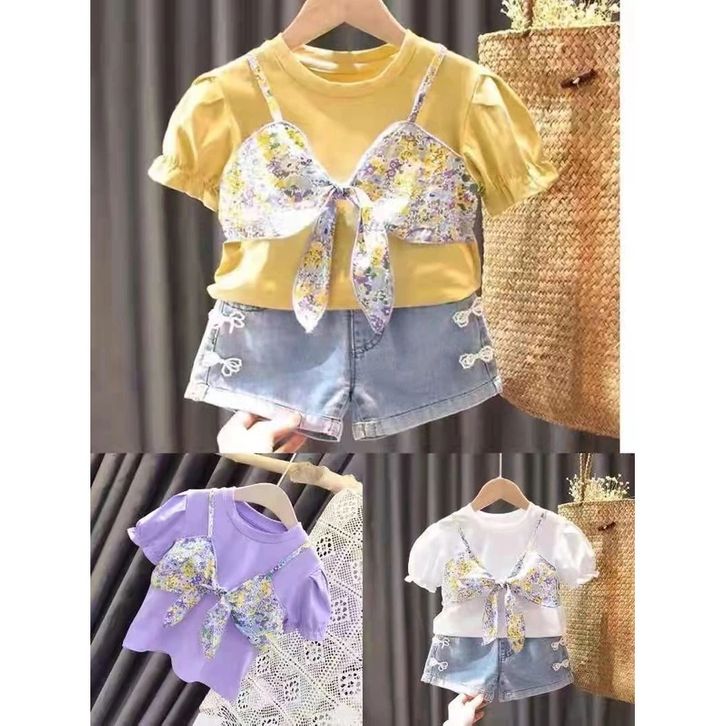 Setelan Anak Perempuan Celana Jeans Pendek + Kaos Lucu Bahan Cottom Import Baju Anak Cewek Lucu Vest Pita Kupu Kupu