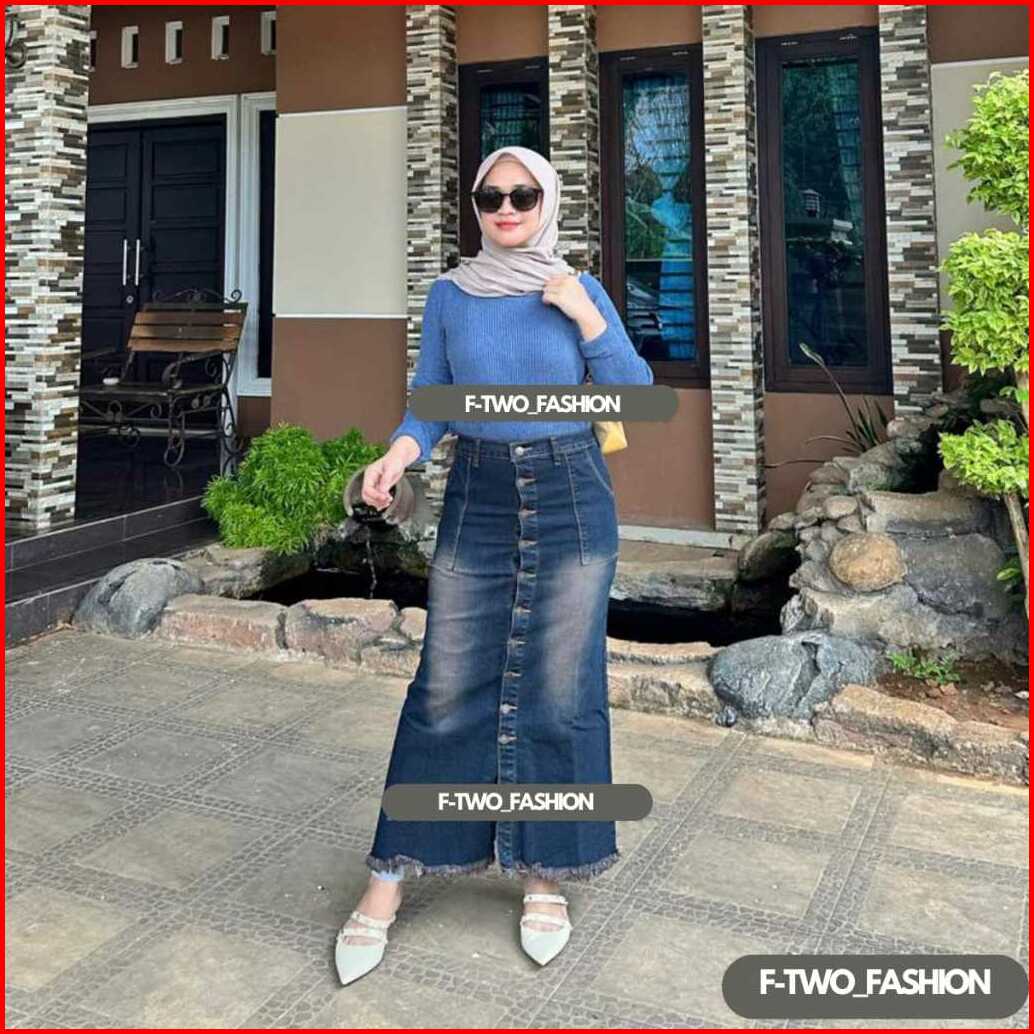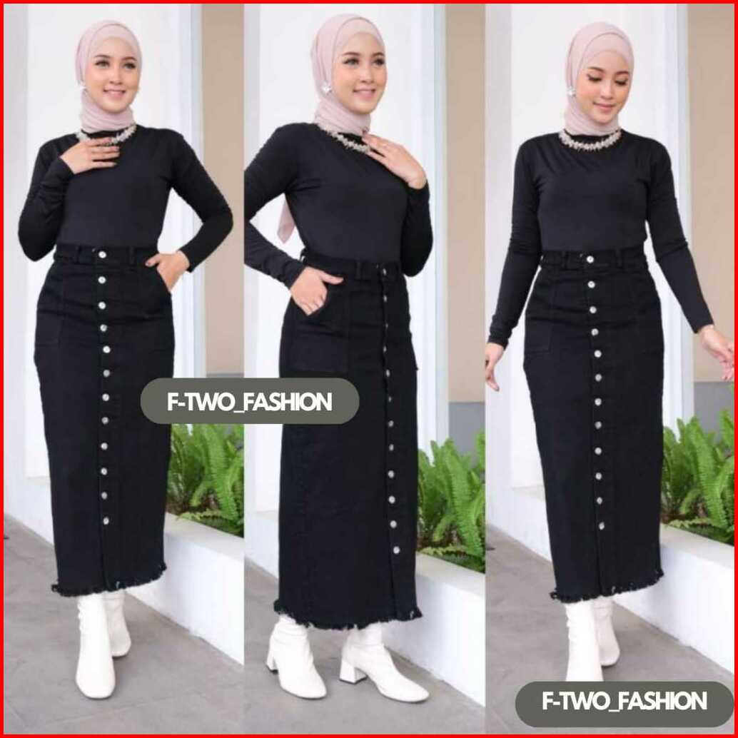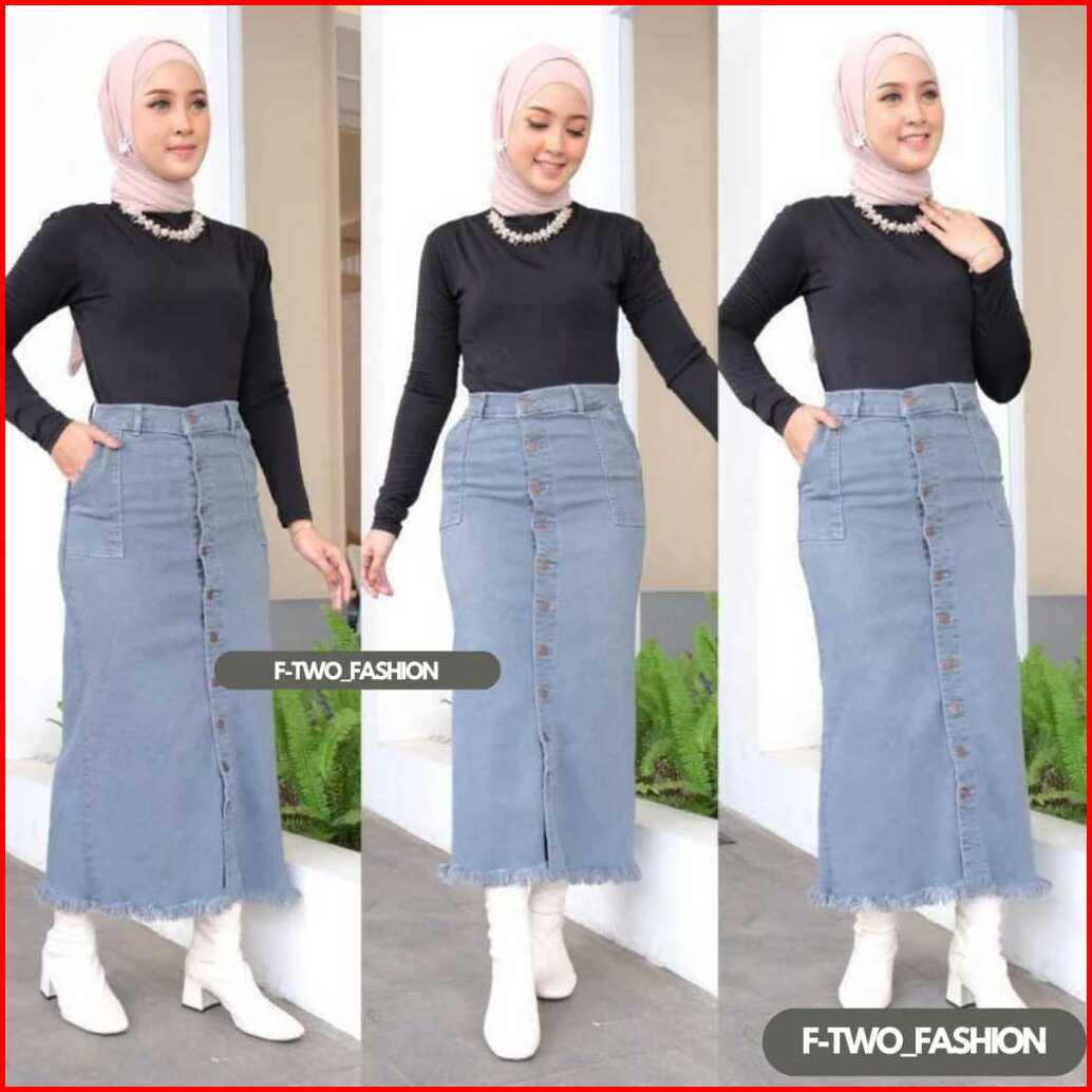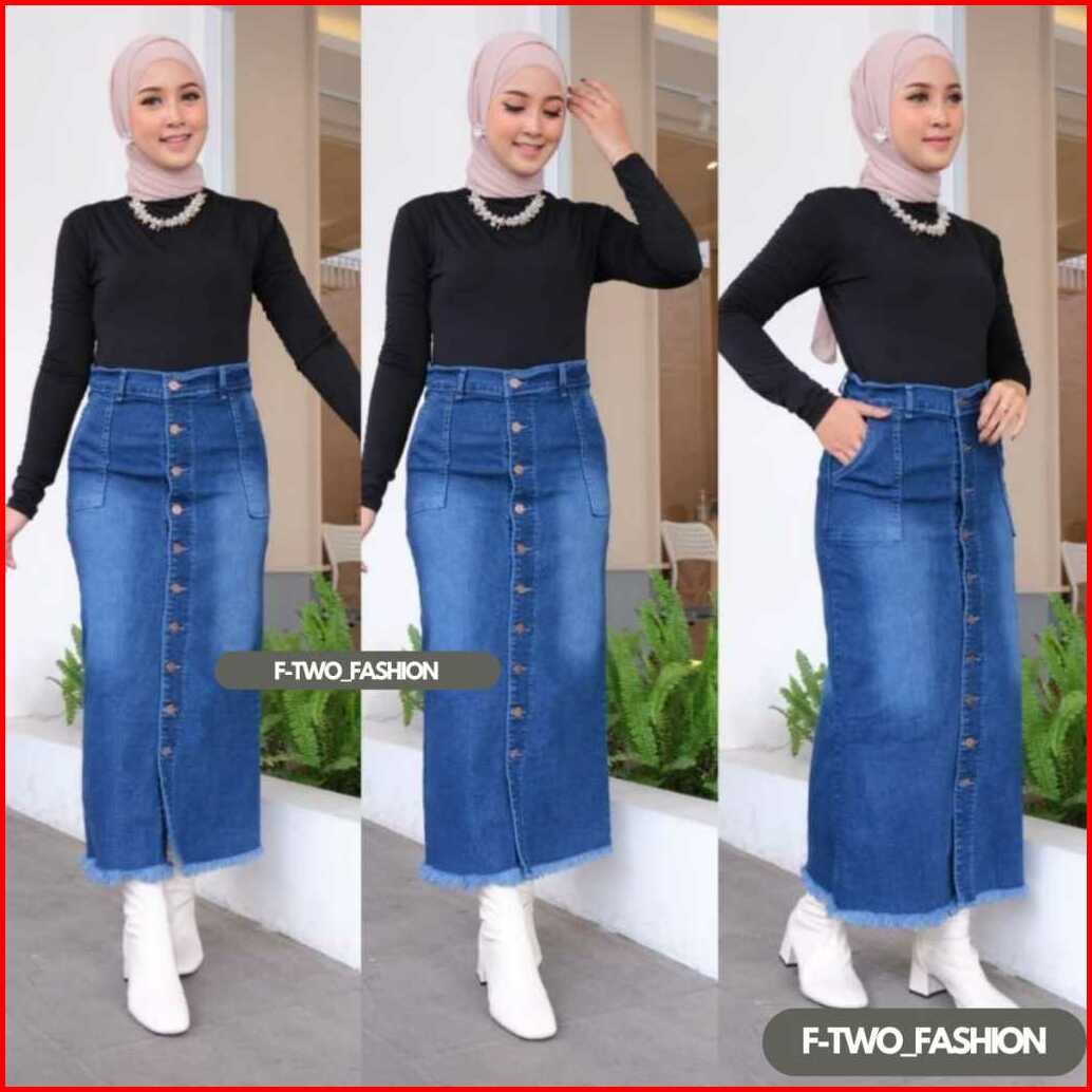 Rok Jeans Streech Span Panjang Gisca Kancing Depan Tebal Melar
