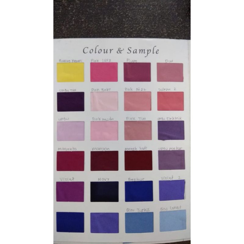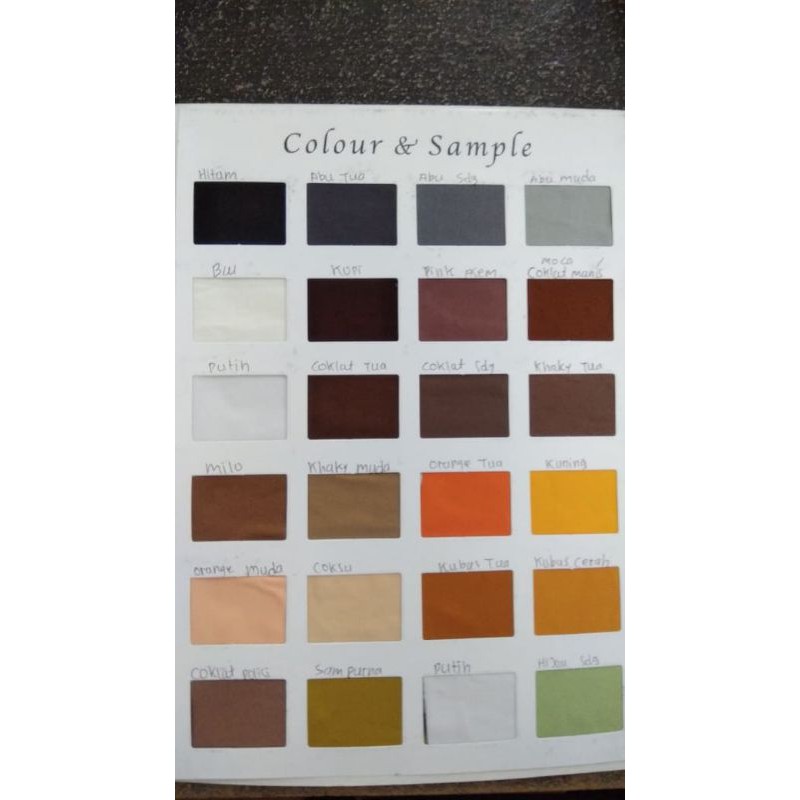 Hitam, Abu tua, Abu sedang, Abu muda, Bw, Kopi, Pink asem, Mocca c. Manis, Putih, Cokelat tua, Cokelat sedang, Khaky tua, Milo, Khaky muda, Orange tua, Kuning, Orange muda, Coksu, Kubus tua, Kubus cerah