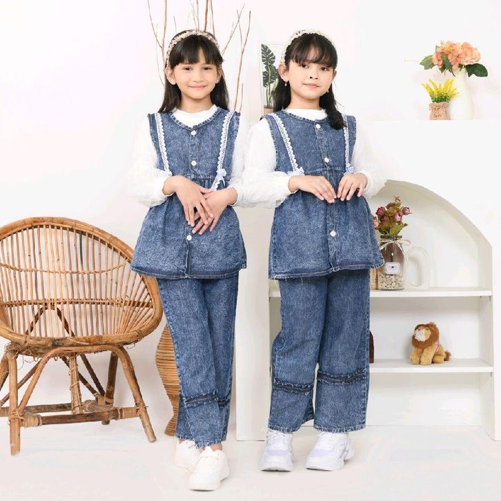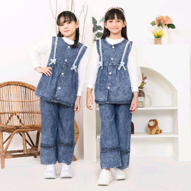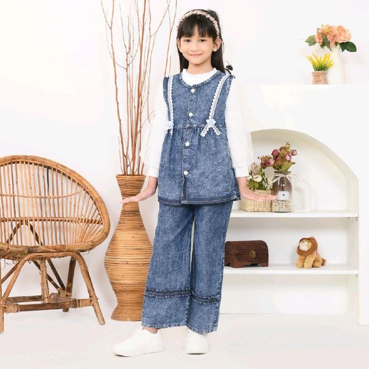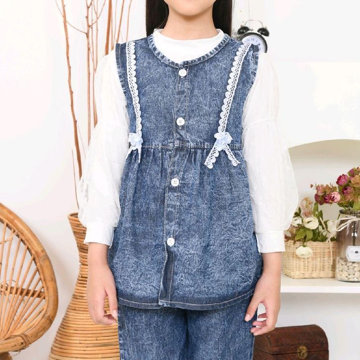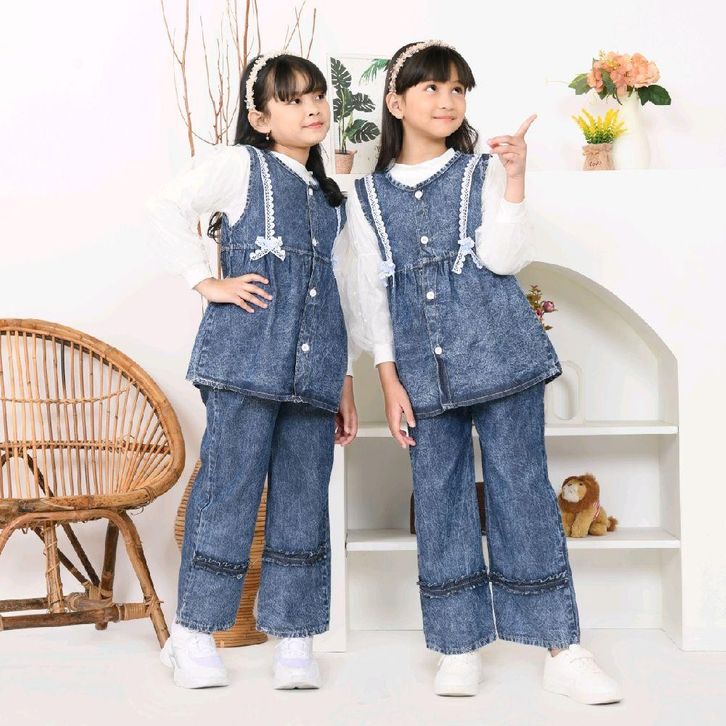 [Star] Set Jeans Anak Perempuan 3 in 1 Liora + Vest Denim Lengan Brukat 1 - 12 Tahun Fashion Parsel Baju Anak Korea