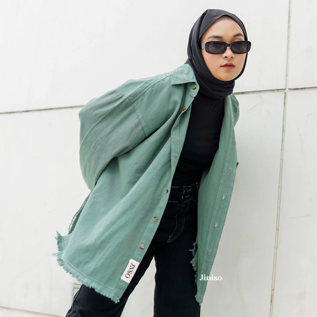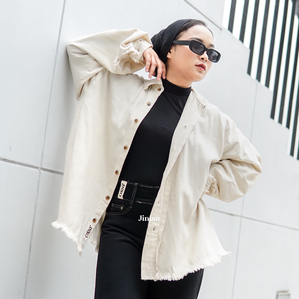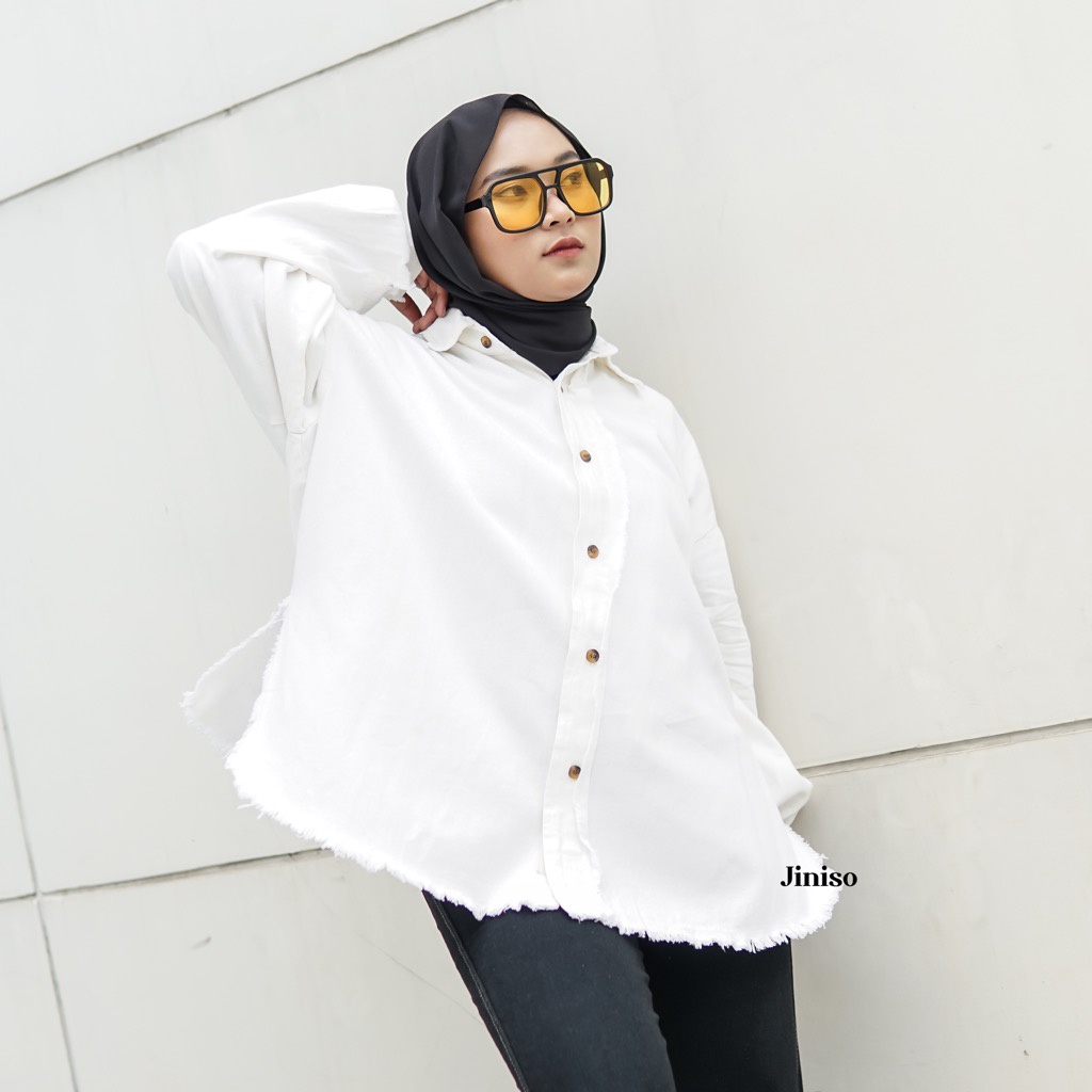 JINISO OFFICIAL STORE - Kemeja Denim Raw Oversize Unisex HYPER ACTIVE - Baju Wanita Jumbo Terbaru Kekinian
