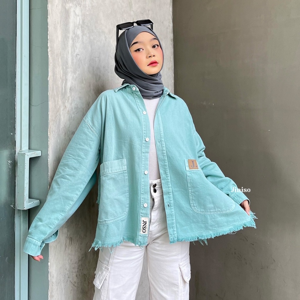 JINISO OFFICIAL STORE - Kemeja Denim Raw Pocket Oversize Unisex HYPER Baju Wanita Kekinian
