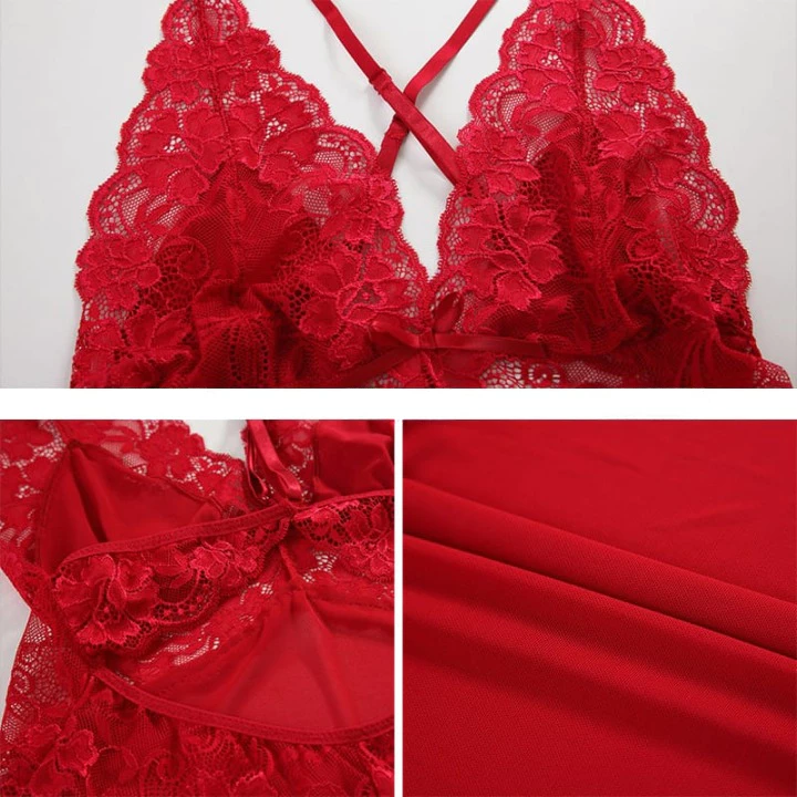Brasay Set Lingerie Wanita Babydoll Deep V-Neck Tanpa Lengan Aksen Renda Celana G-String 3012