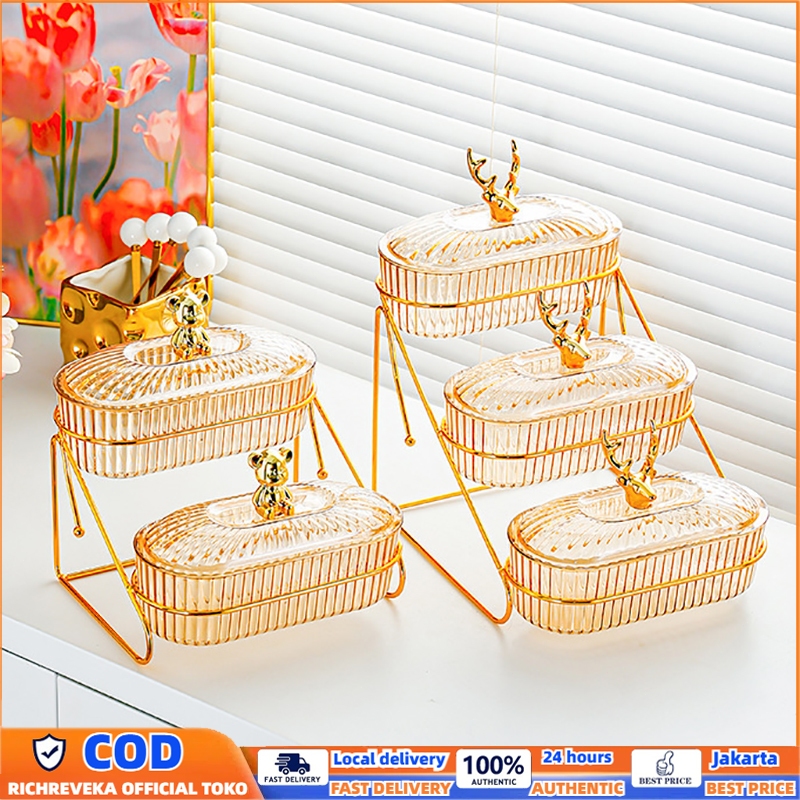 Ready Stock 3 Tingkat Tempat Buah Rangka Besi Baki Dengan Tutup Rusa Toples Tempat Buah Snack Kopi Makanan Ringan Wadah