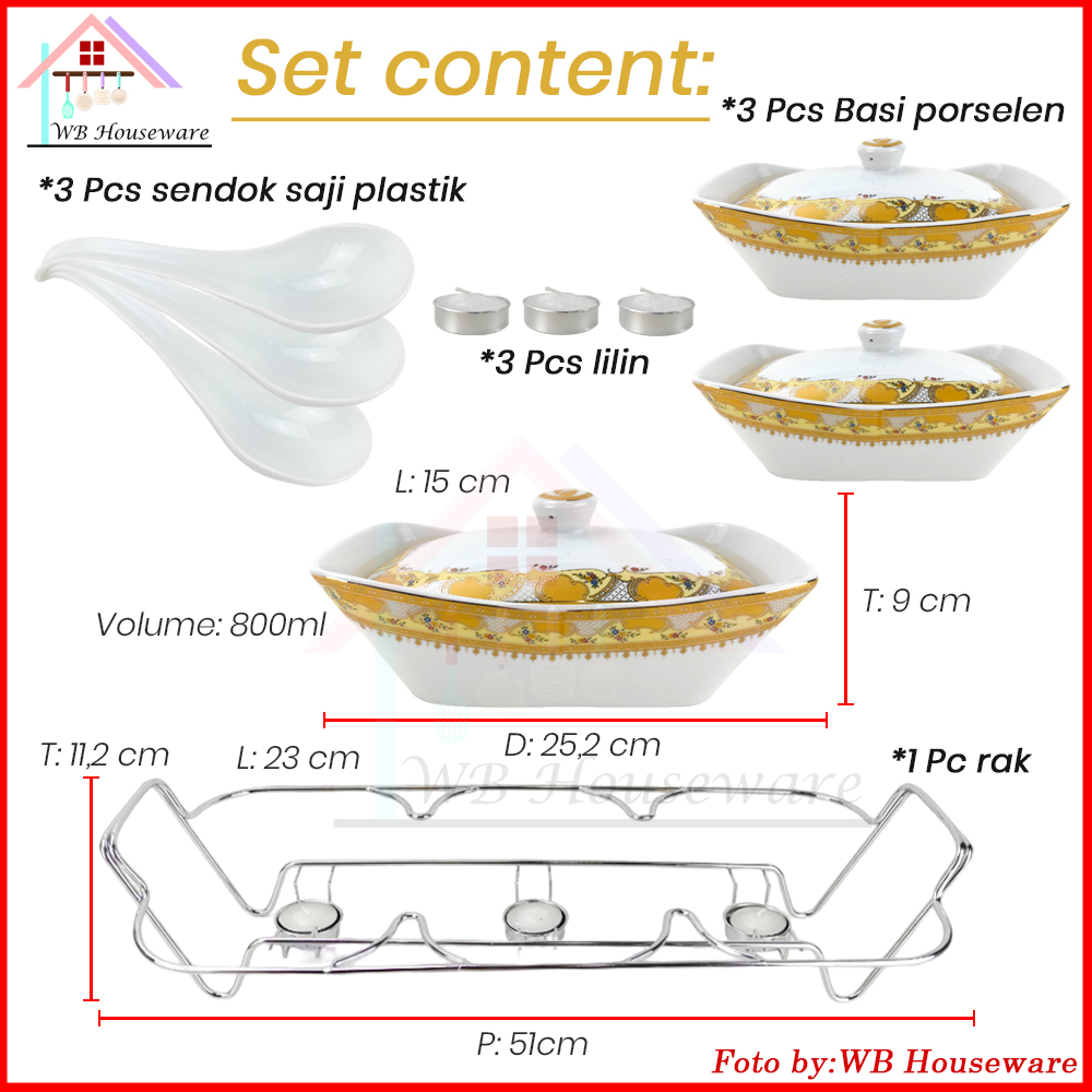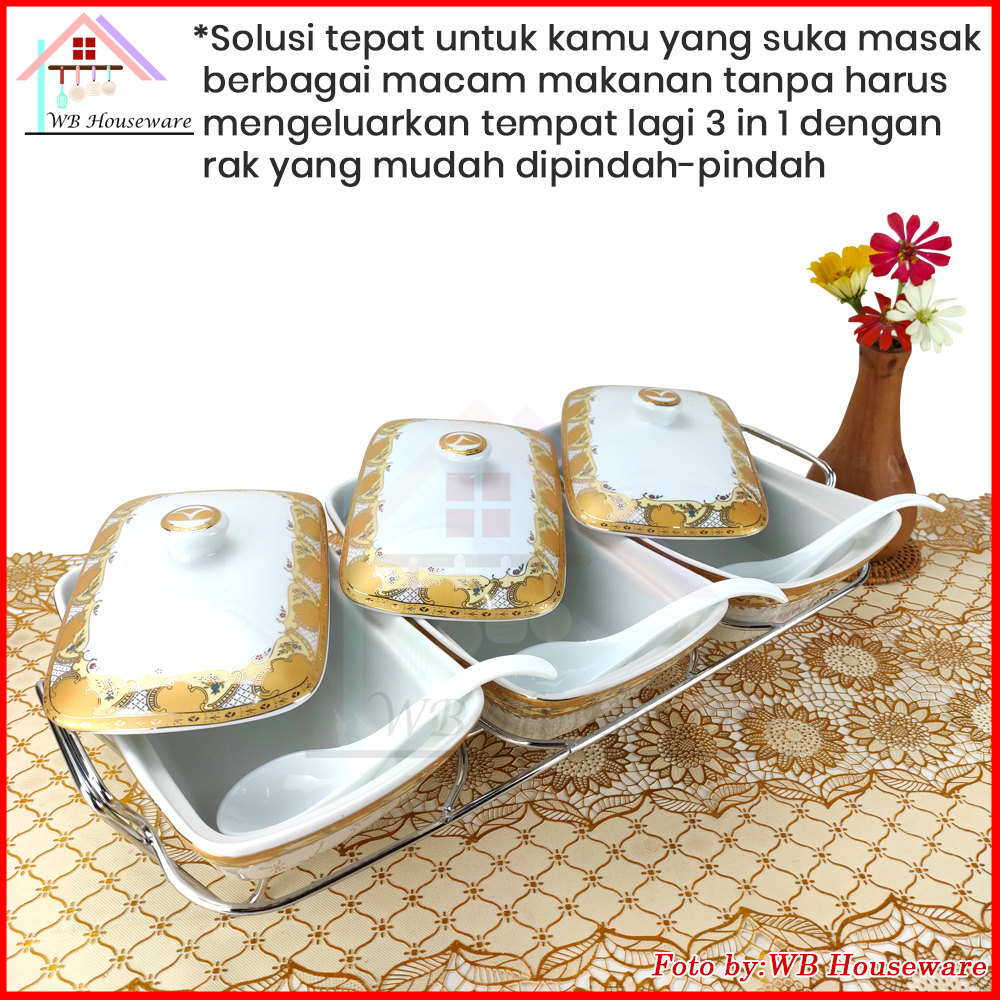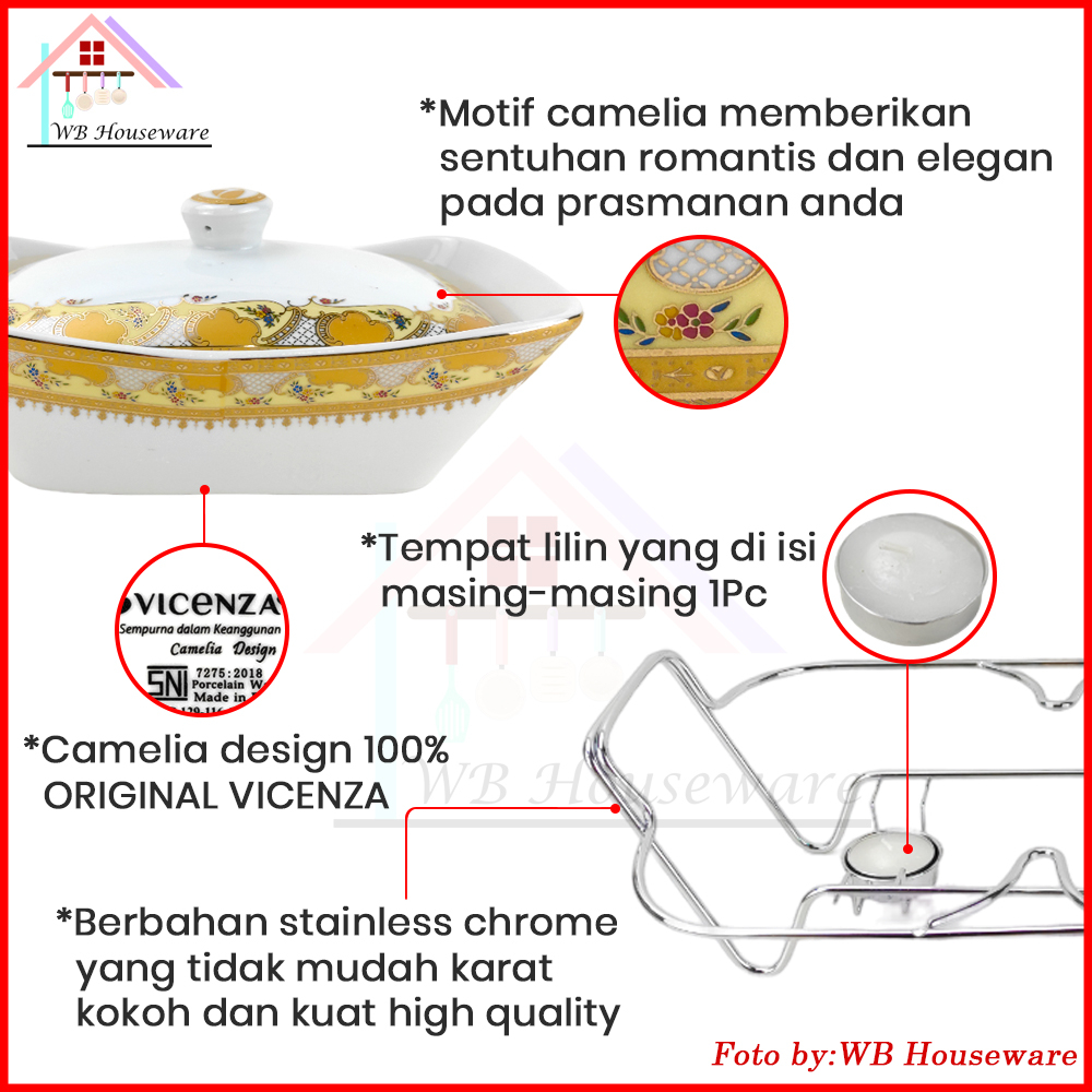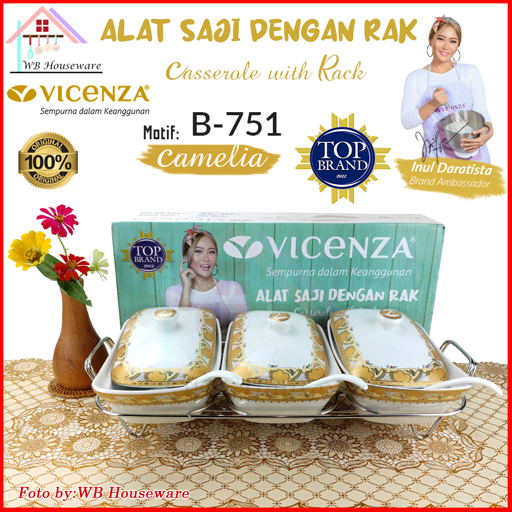 VICENZA wadah saji set isi 3 + rak motif Camelia / pemanas makanan / casserole food warmer keramik B-751