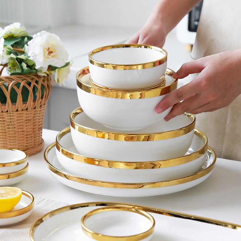 ASHOME Piring Makan Keramik Putih Gold / Piring Putih Keramik List Gold / Mangkuk Keramik Putih Gold Elegan / Piring Ker