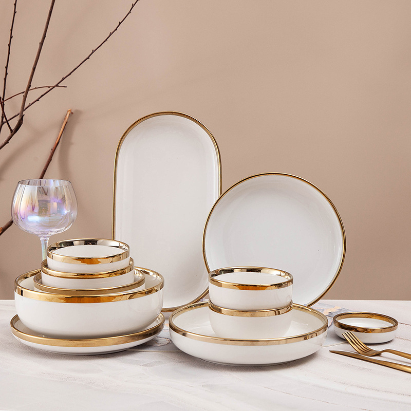 ASHOME Piring Makan Keramik Putih Gold / Piring Putih Keramik List Gold / Mangkuk Keramik Putih Gold Elegan / Piring Ker