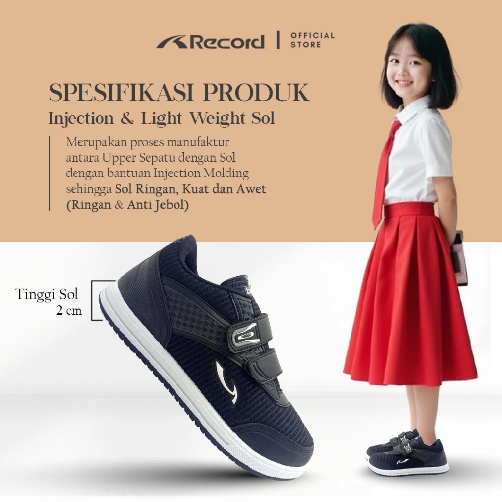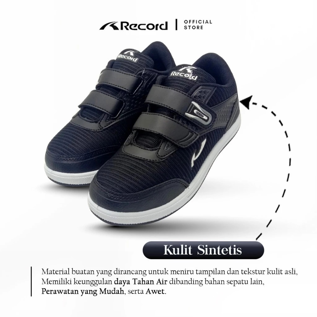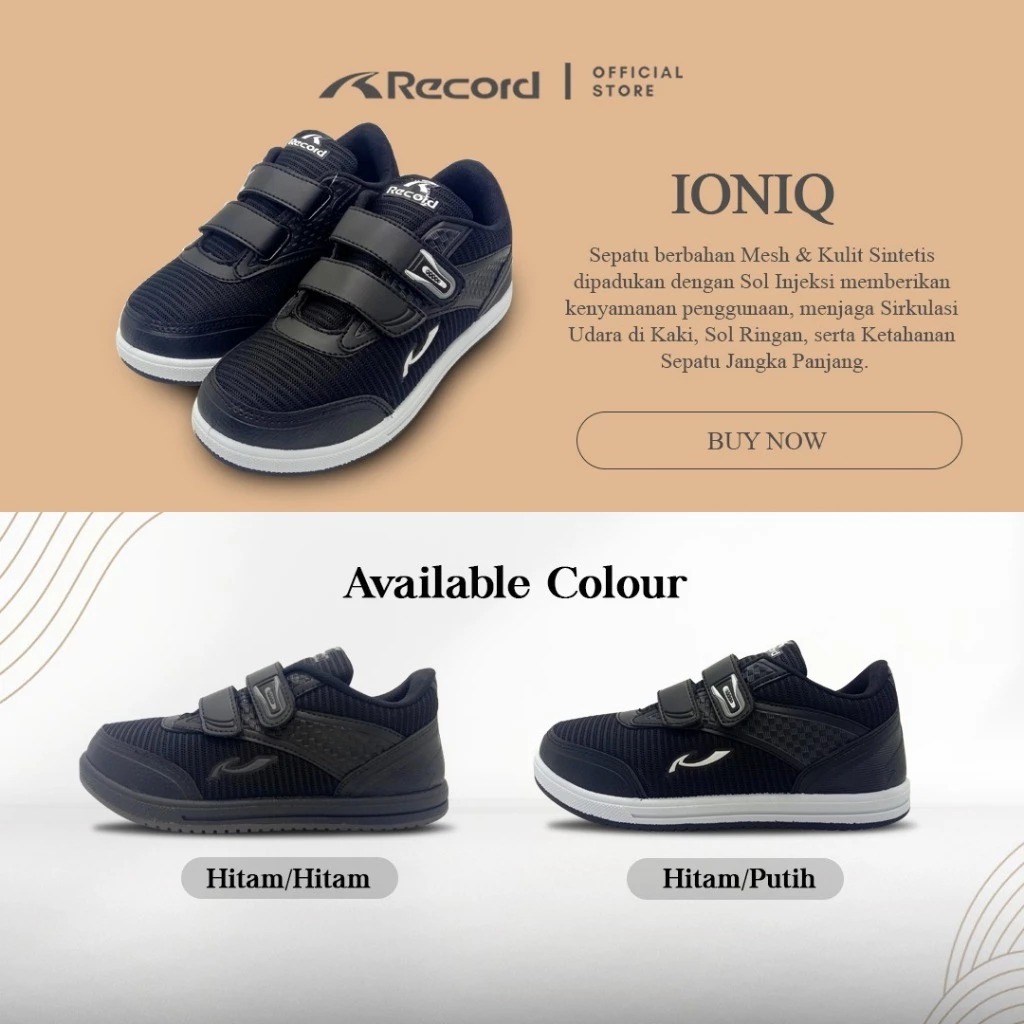 SEPATU SEKOLAH ANAK RECORD IONIQ LAKI-LAKI PEREMPUAN TK SD SMP BLACK HITAM PUTIH PEREKAT [GRATIS ONGKIR]