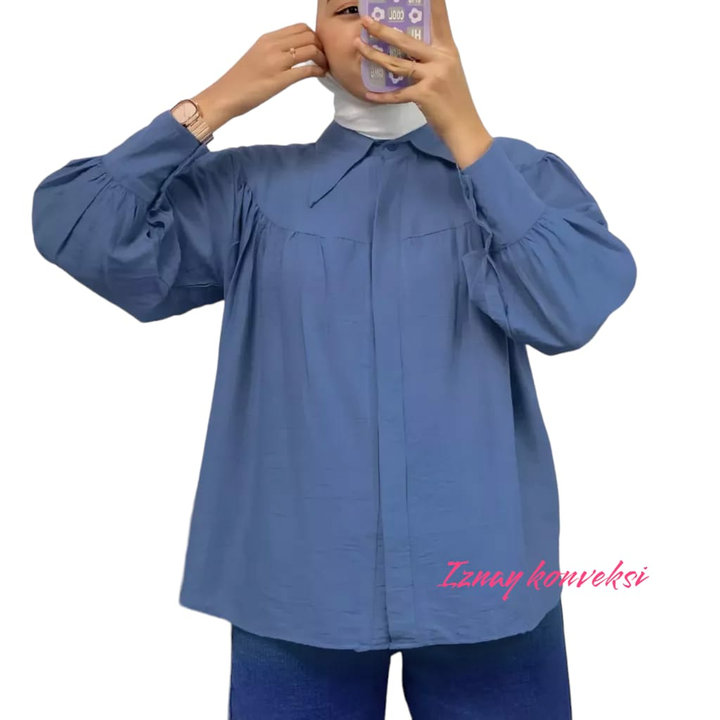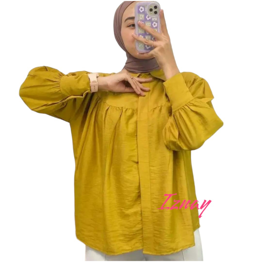 (Gratis Ongkir) Kemeja Blouse Sisil Polo Linen Lengan Balon Oversize
