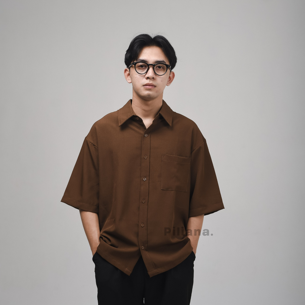 kemeja pria lengan pendek Piliana Kemeja Pria Lengan Pendek Oversize Brown Kemeja Boxy