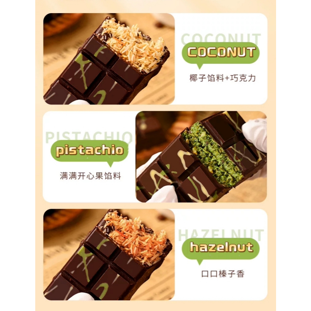 Cokelat Hazelnut, Cokelat rasa COCONUT, Cokelat pistachio, Tiga rasa