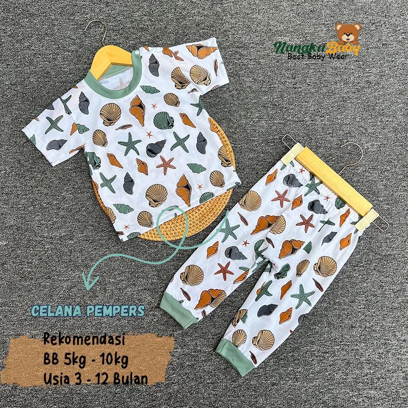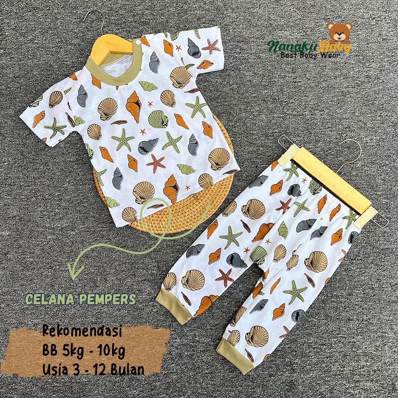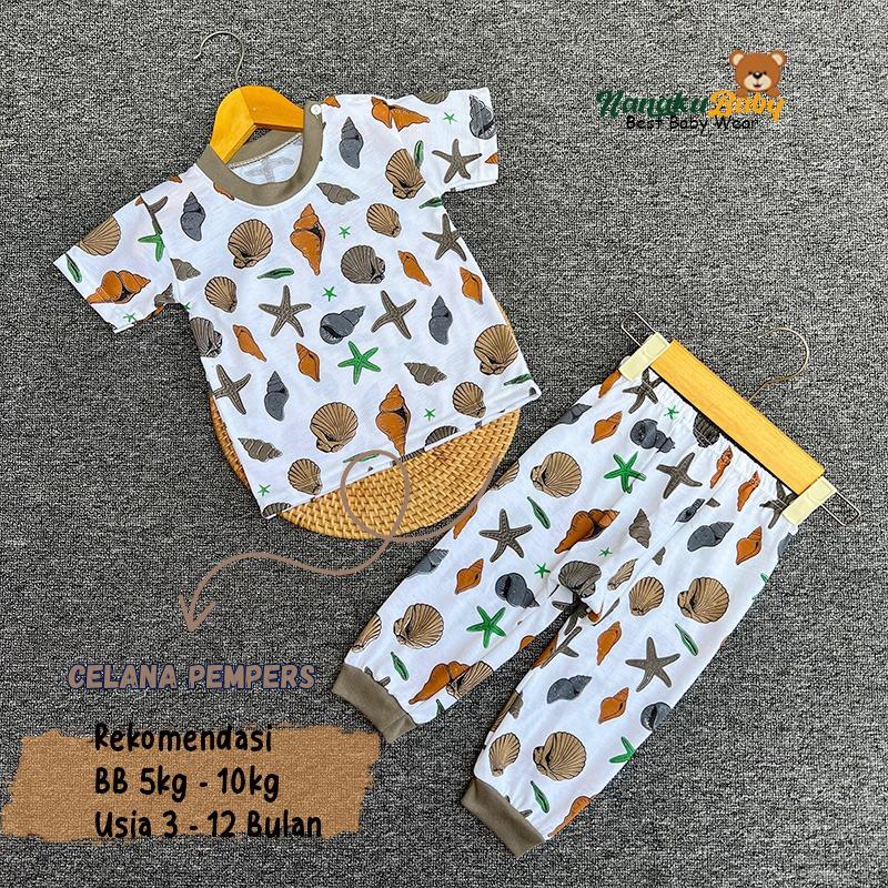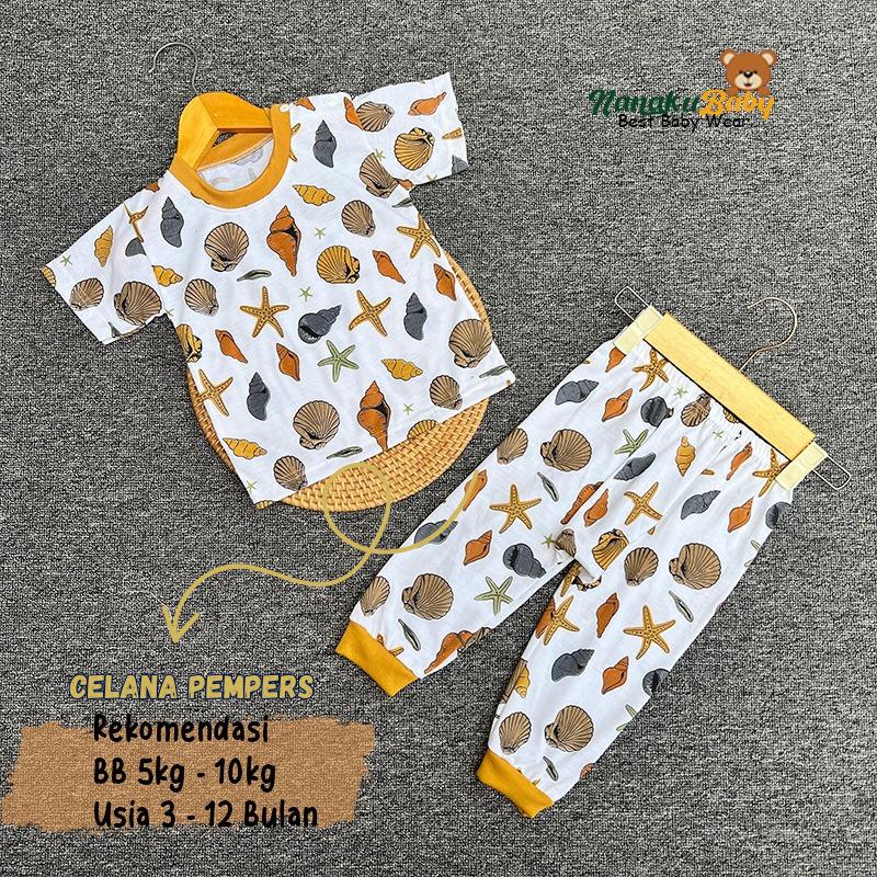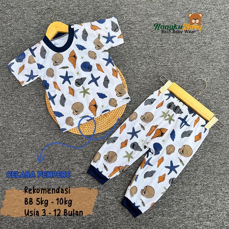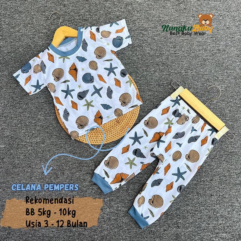 Nanaku Baby Setelan Baju Bayi Unisex Model Lengan Pendek Celana Pempers Panjang Usia 3-12 Bulan Motif Seaworld