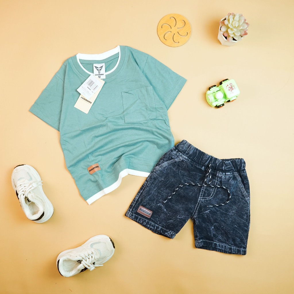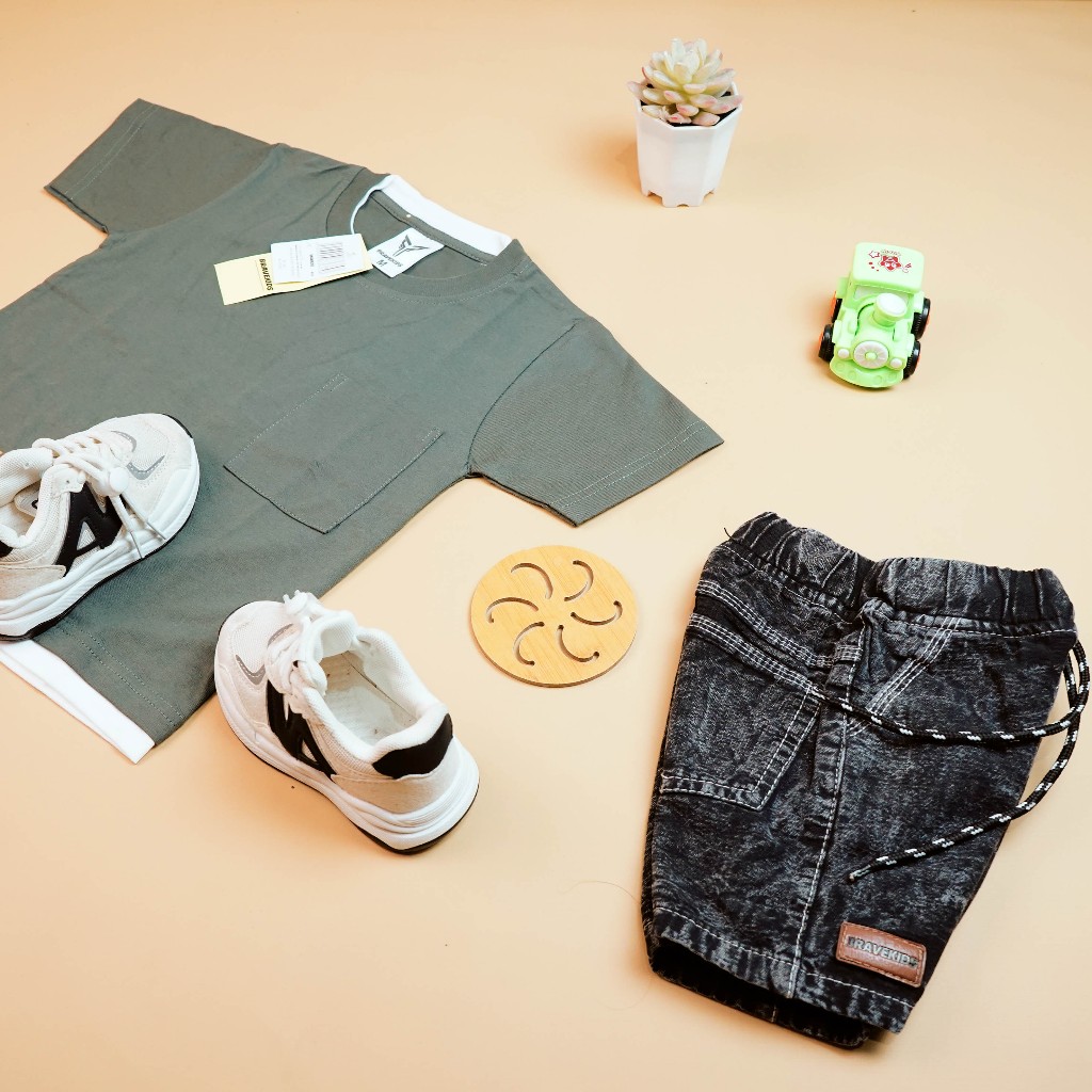 BRAVEKIDS - SETELAN ANAK KAOS POLOS POCKET TWO LAYER POLOS ANAK COTTON COMBED 24S CELANA DENIM
