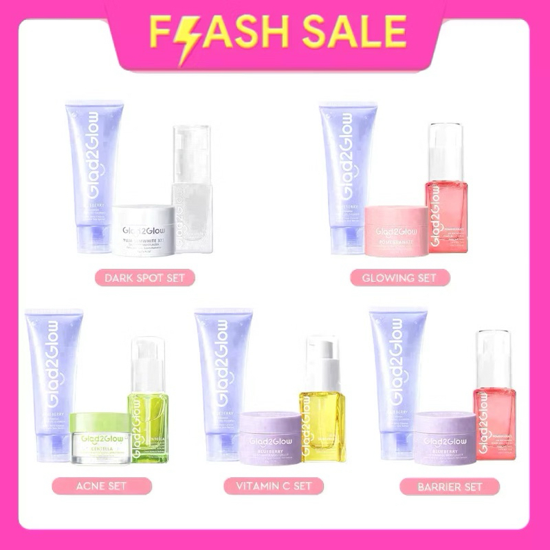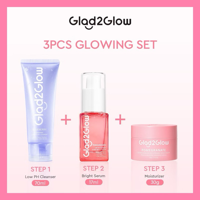 Paket Glad2Glow Skincare Set 3pcs Set Facial Cleanser + Serum + Moisturizer Blueberry Low pH Gel Cleanser Serum Wajah Pe