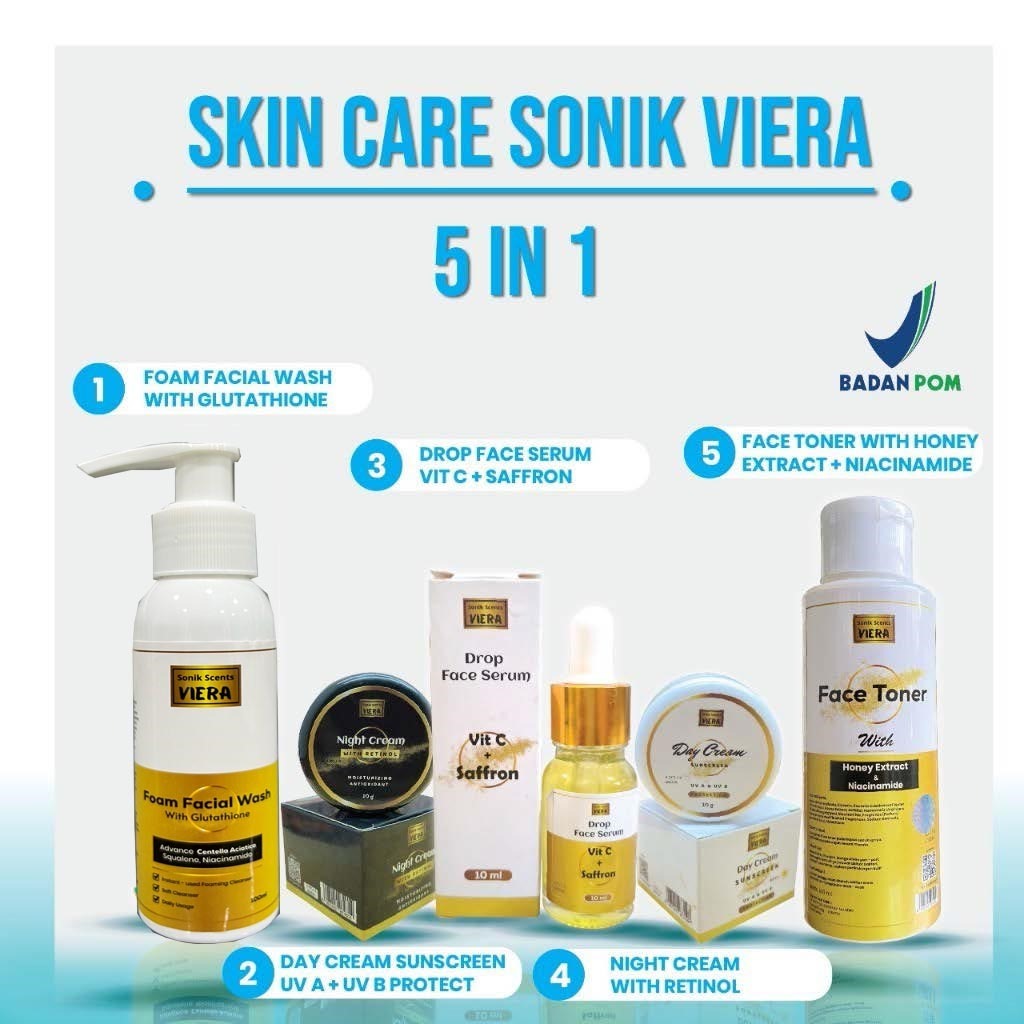 Paket 5 in 1 Sonik Viera Perawatan Wajah Sonik Viera: Day Cream, Night Cream, Facial Foam, Serum Vit C, Toner Mencerahka