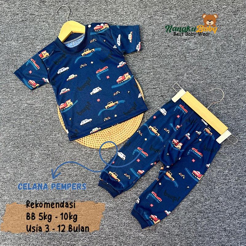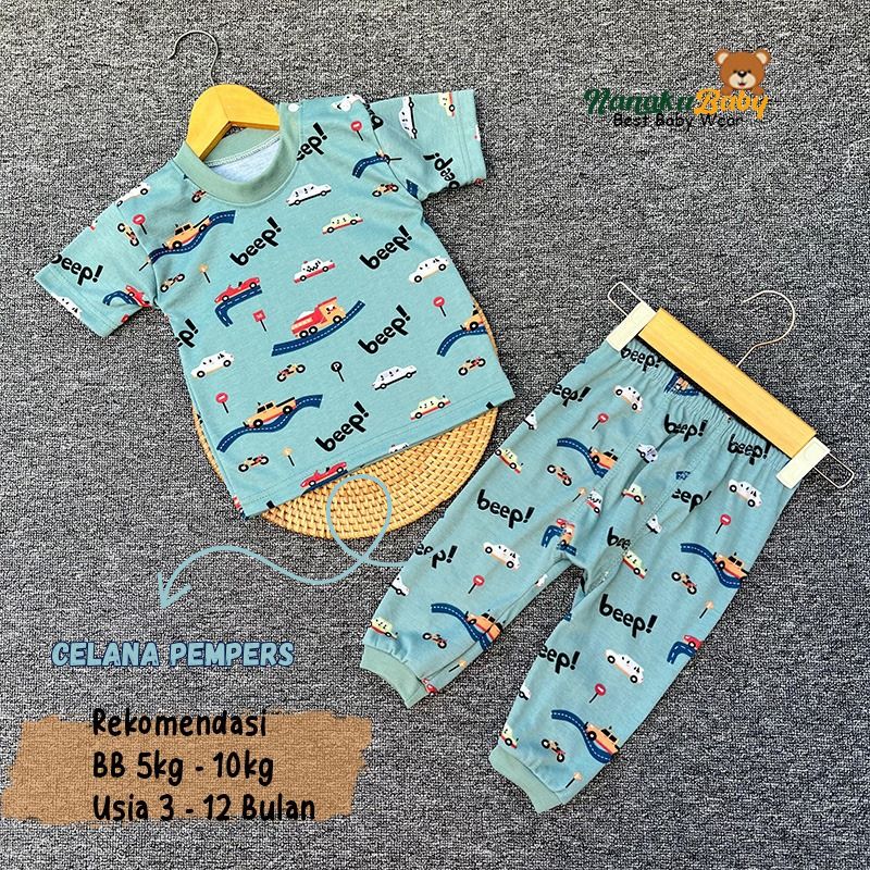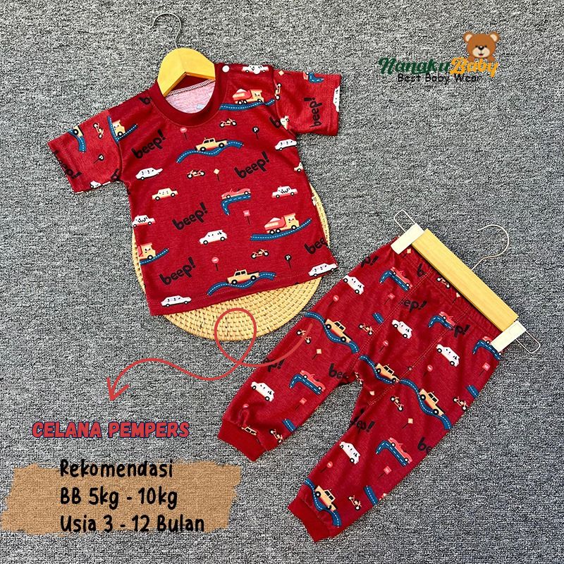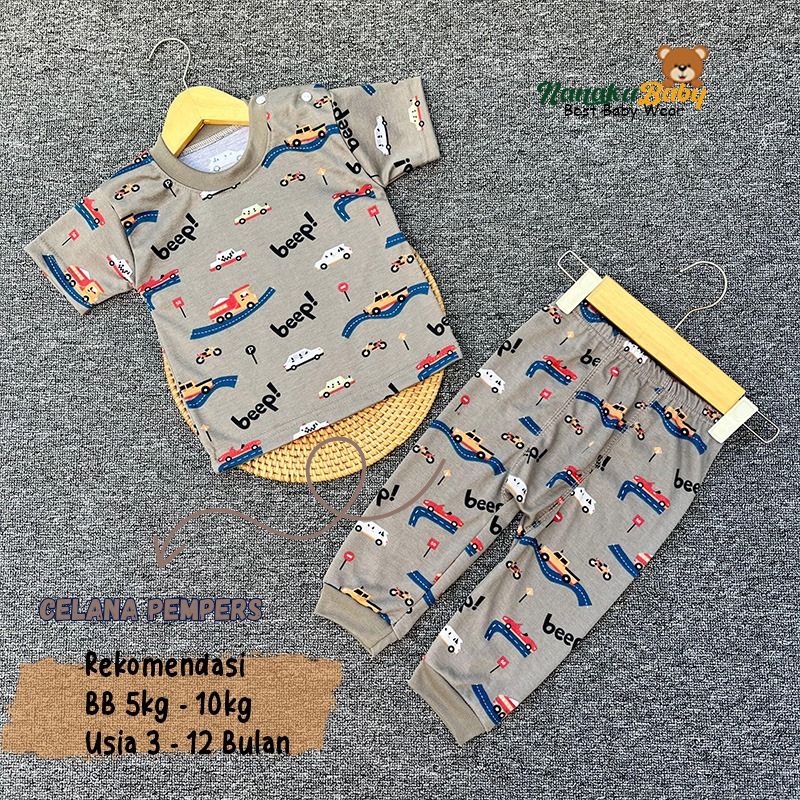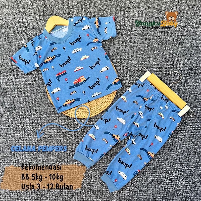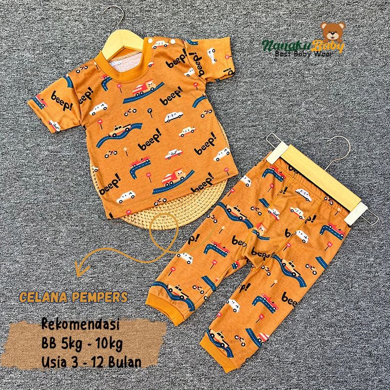 Nanaku Baby Setelan Baju Bayi Unisex Model Lengan Pendek Celana Pempers Panjang Usia 3-12 Bulan Motif Printing Beep