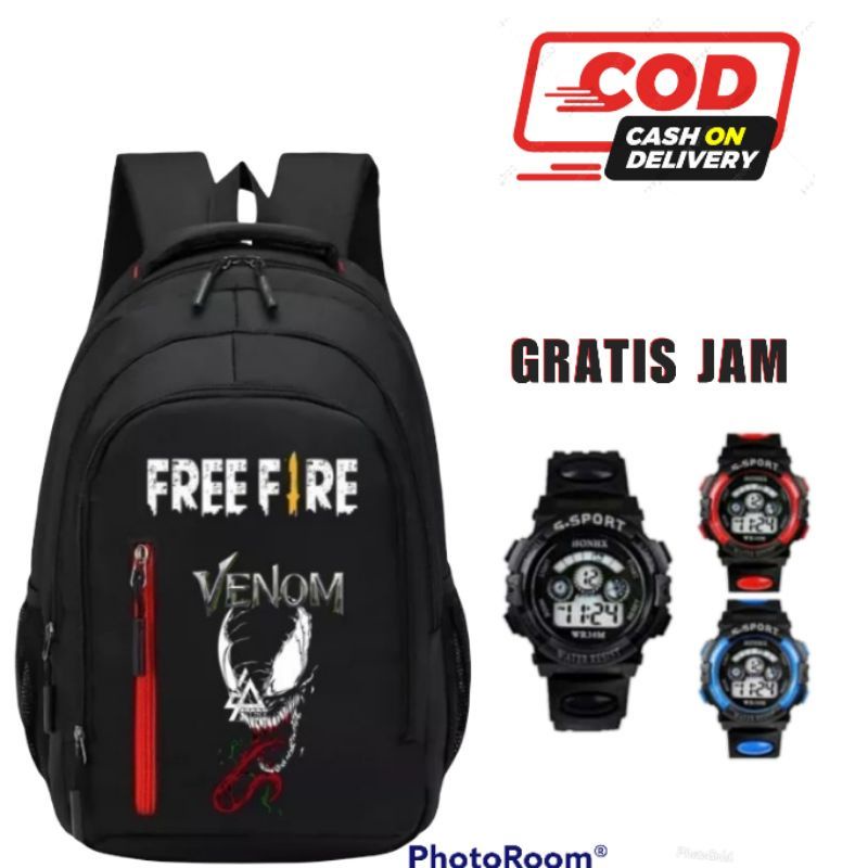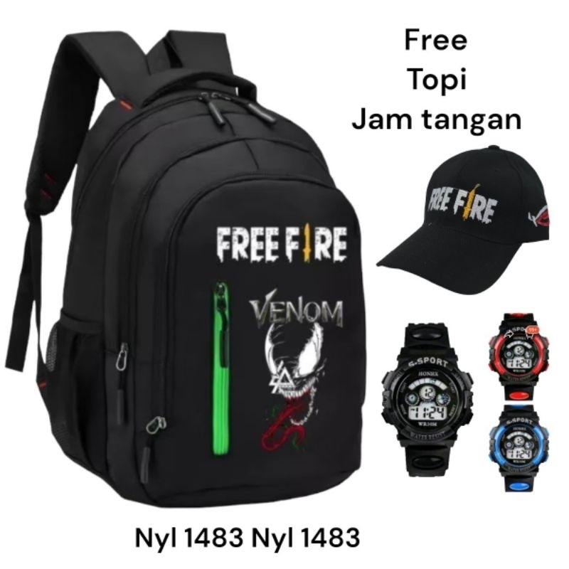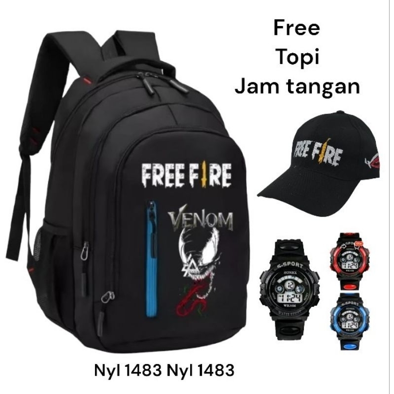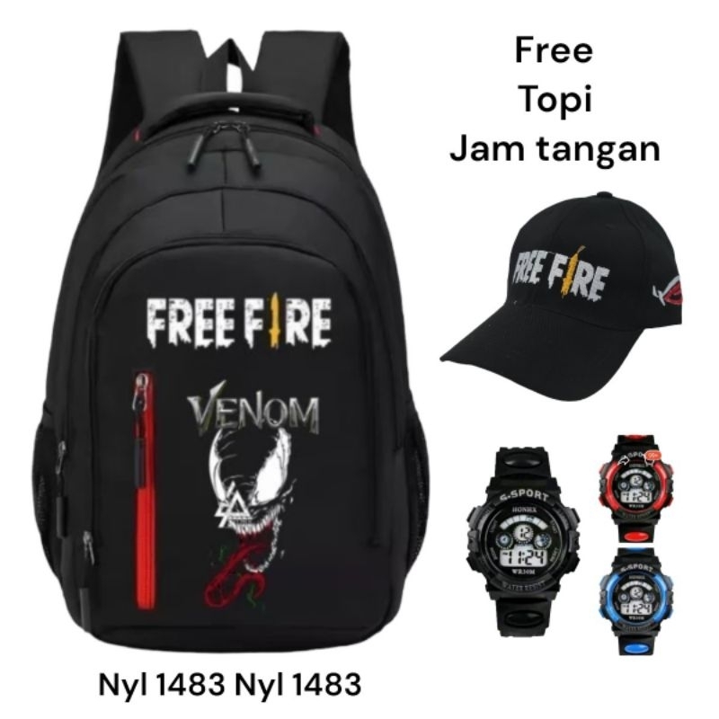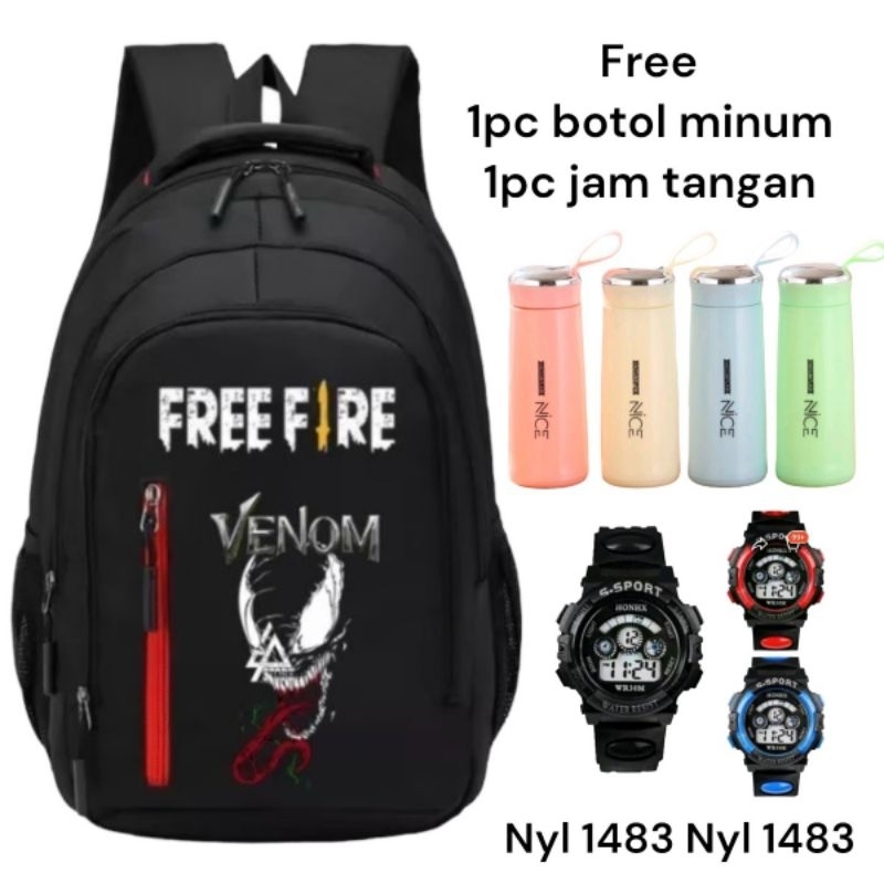 Tas Ransel Anak Sekolah SD SMP Tas Anak Laki laki Motif FREE FIRE VENOM Gratis Botol dan Jam Tangan