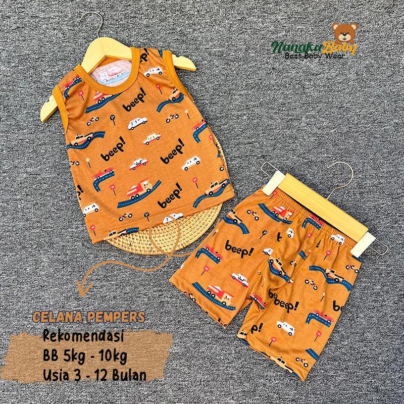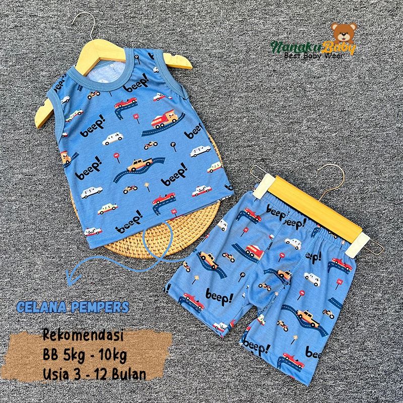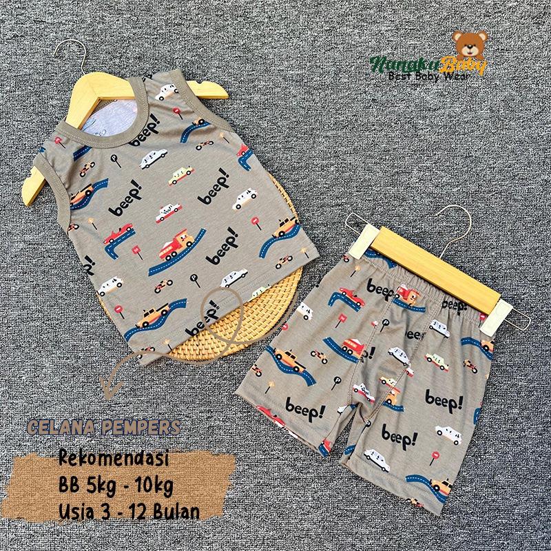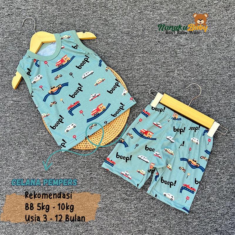 Nanaku Baby Setelan Baju Bayi Unisex Model Lengan Singlet Celana Pempers Pendek Usia 3-12 Bulan Motif Printing Beep