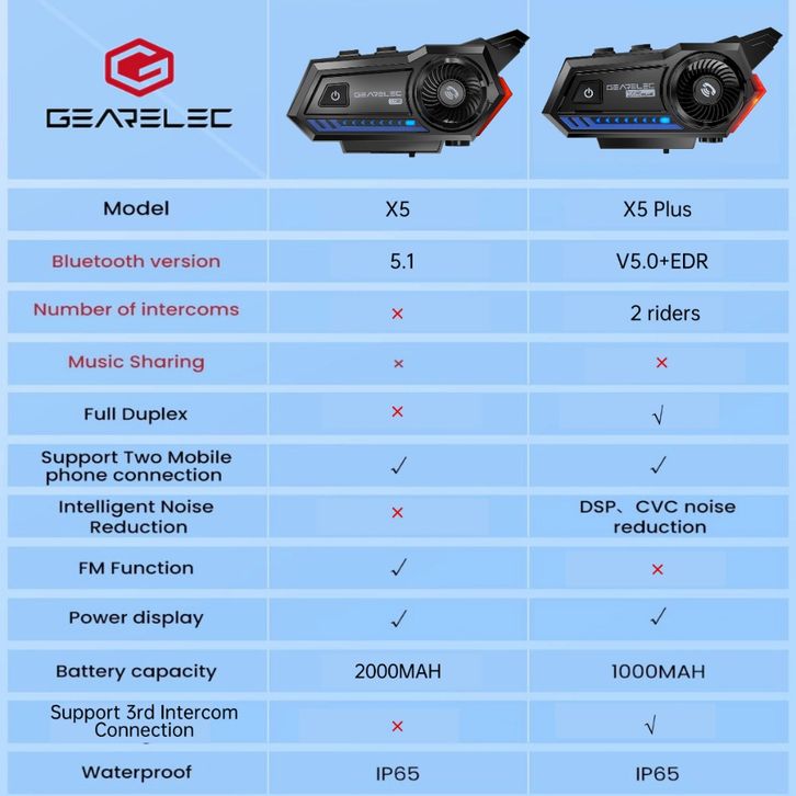 GEARELEC X5 Bluetooth 5.1 Headset Helm Sepeda Motor Earphone Nirkabel Tahan Air dengan FM radio 2000mAh