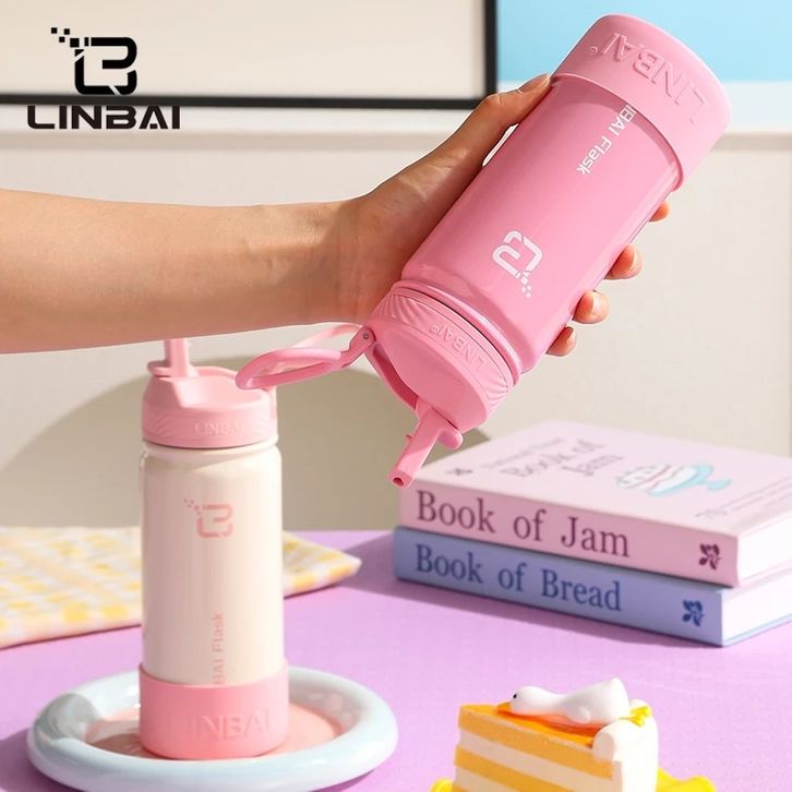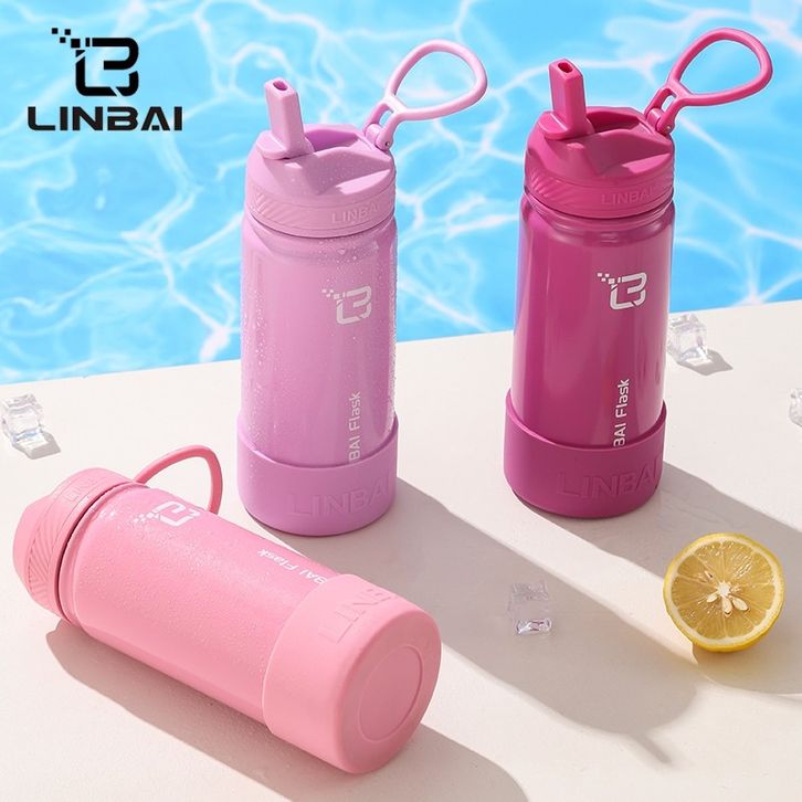 LINBAI Flask 16oz Kids Insulated Tumbler Water Bottle With Straw Stainless Steel Vacuum Hot and Cold Cup