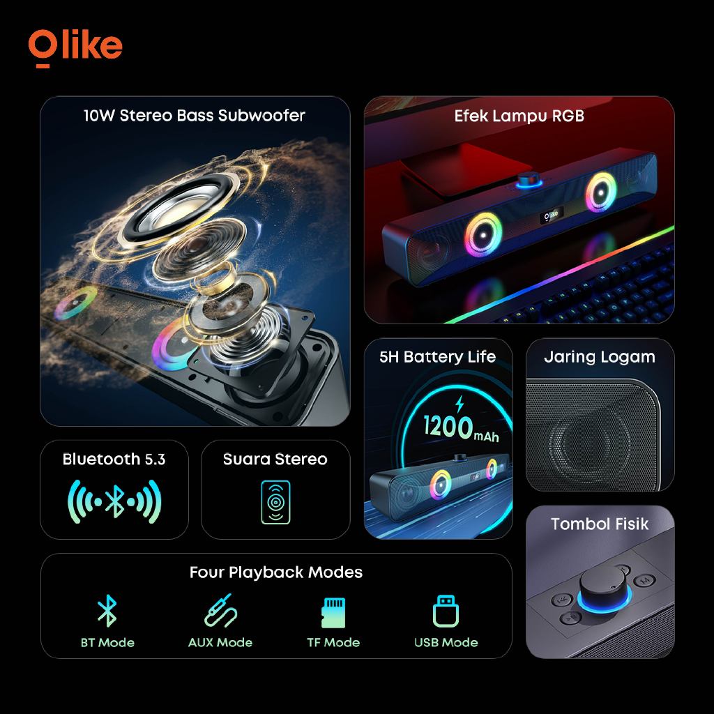 Speaker Soundbar Olike S5h Rgb 1200mah 5 Jam Stereo Bass Subwoofer