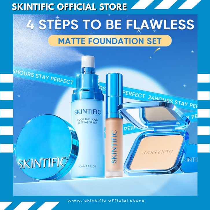 SKINTIFIC 4pcs Package Paket Perfect Matte Makeup Set Serum Concealer Matte Cushion Ultra Cover Powder Setting Spray