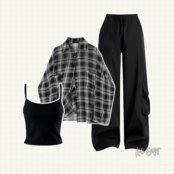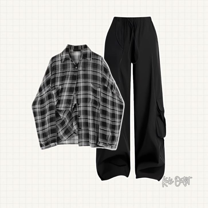 Termurah&Terbaru✅ 1 Set OOTD Korean Style (Kemeja Flanel + Celana Cargo + Tanktop) One Set Wanita Perempuan - KK125
