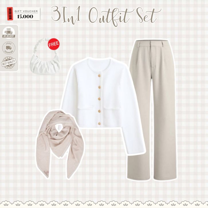Termurah&Terbaru✅ One Set Korean Style Hijab Kekinian | Gemma Blazer Putih, Celana Knit Ivory, Hijab Bella Square Cream