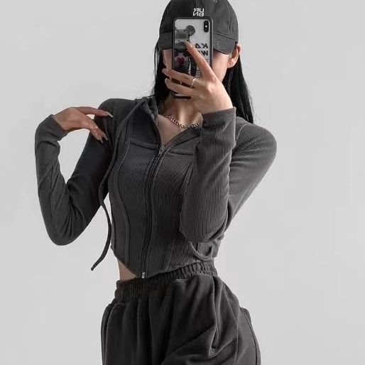 【MISSHONEY】Cropped Drawstring Full Zip Hoodie Sweatshirt 7444
