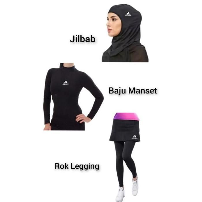 Baju Olahraga Wanita 3 IN 1 - Stelan Olahraga Wanita Baju Manset Lengan Panjang Celana Legging Baselayer Dan Jilbab Spo