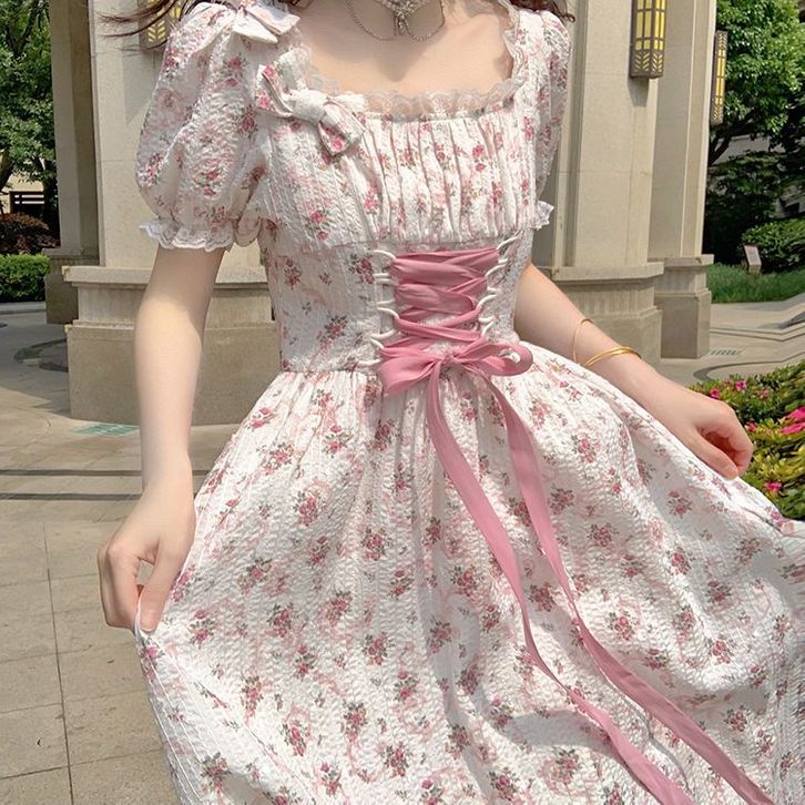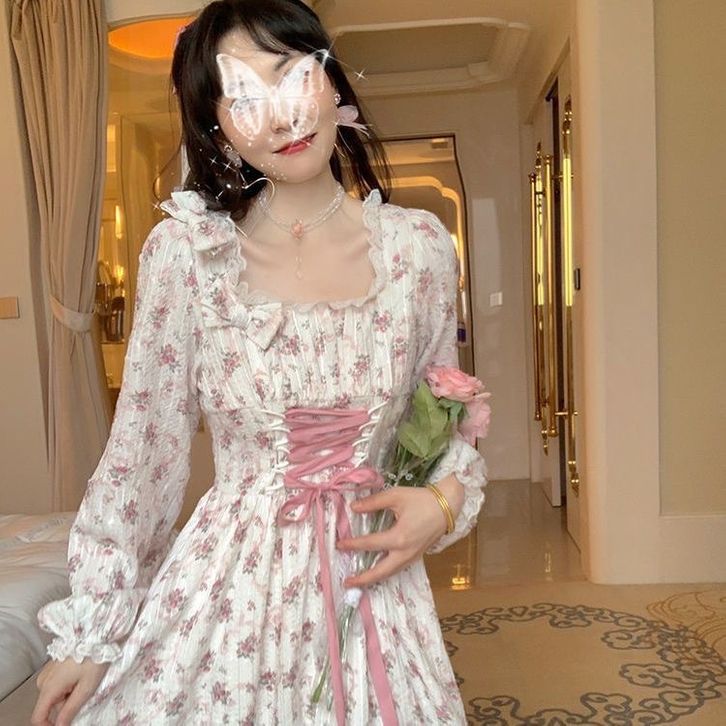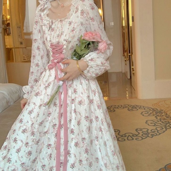 vintage korean pink midi dress korea floral Bunga Long fairy Dress Wanita gaun princess