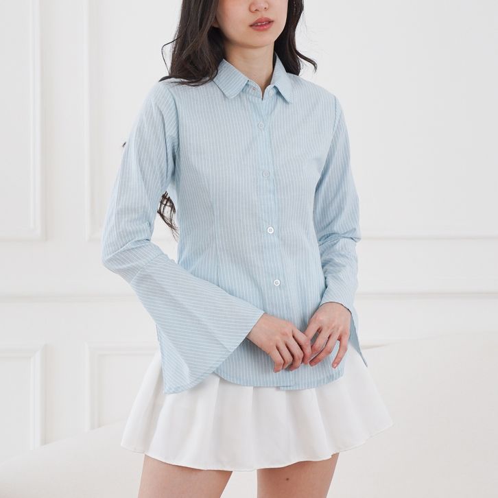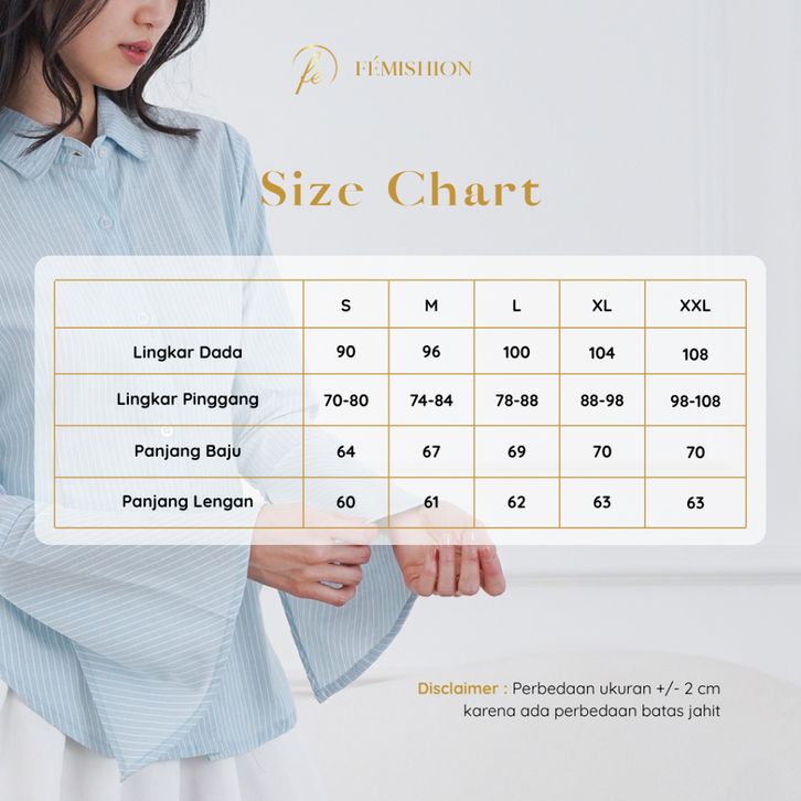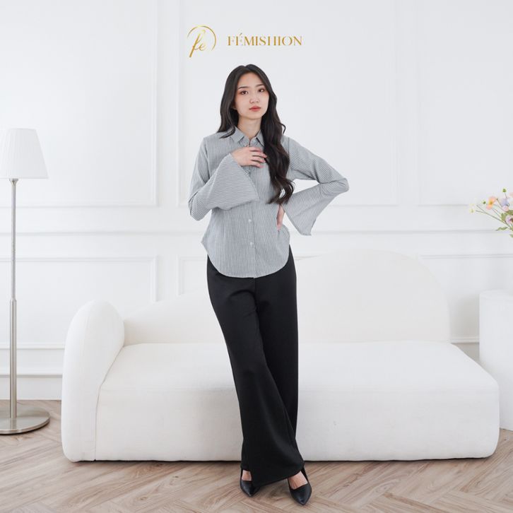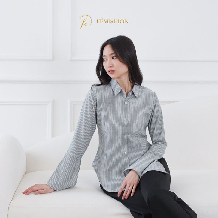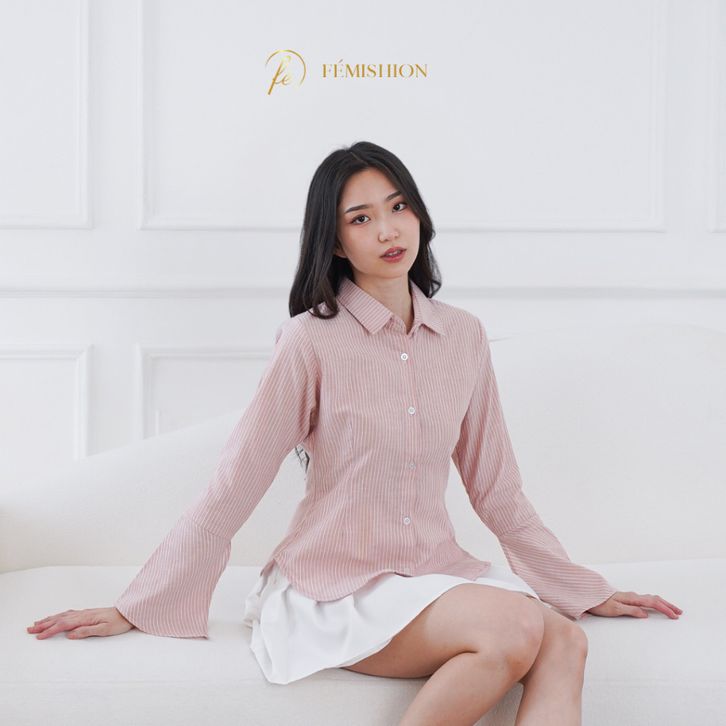 FEMISHION Career Glow | Kemeja Kerja Wanita Atasan Salur Berkaret Fitted Press Body Pink Biru Abu Slim