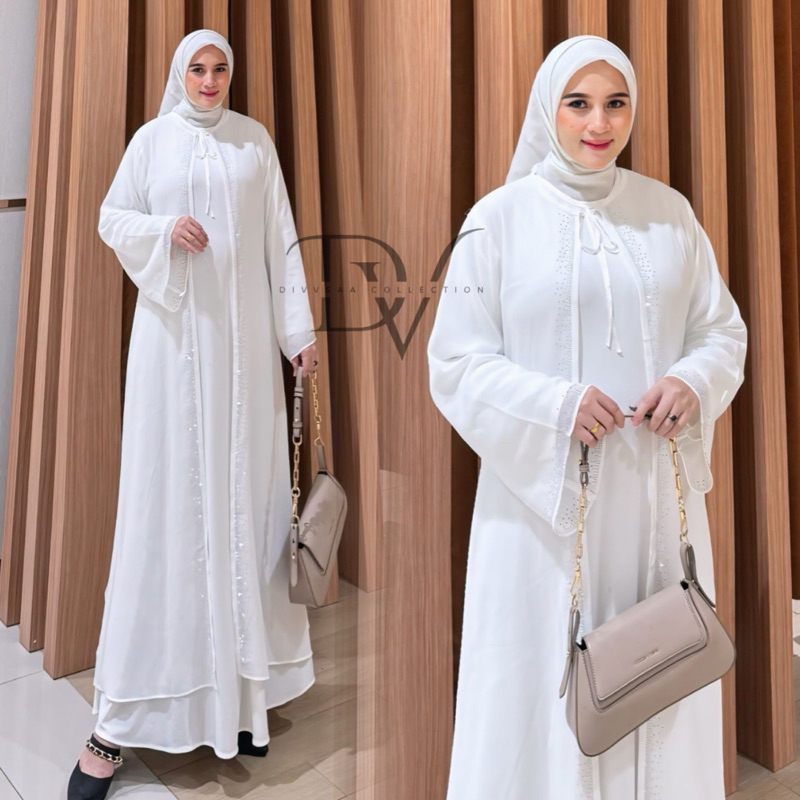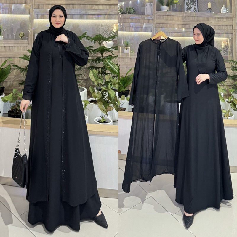 1 SET GAMIS ABAYA TURKEY INNER OUTER VARIASI PITA PAYET SWAROVSKI SILVER DAN FULLHITAM DIVVSAA COLLECTION TERBARU