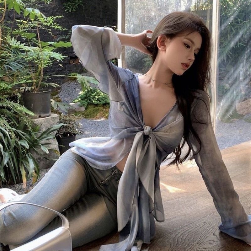 Kemeja Terbaru Biru Tie Dye Lengan Panjang Rumlai Gaya V Neck Outfit Korea Kekinian Baju Pantai