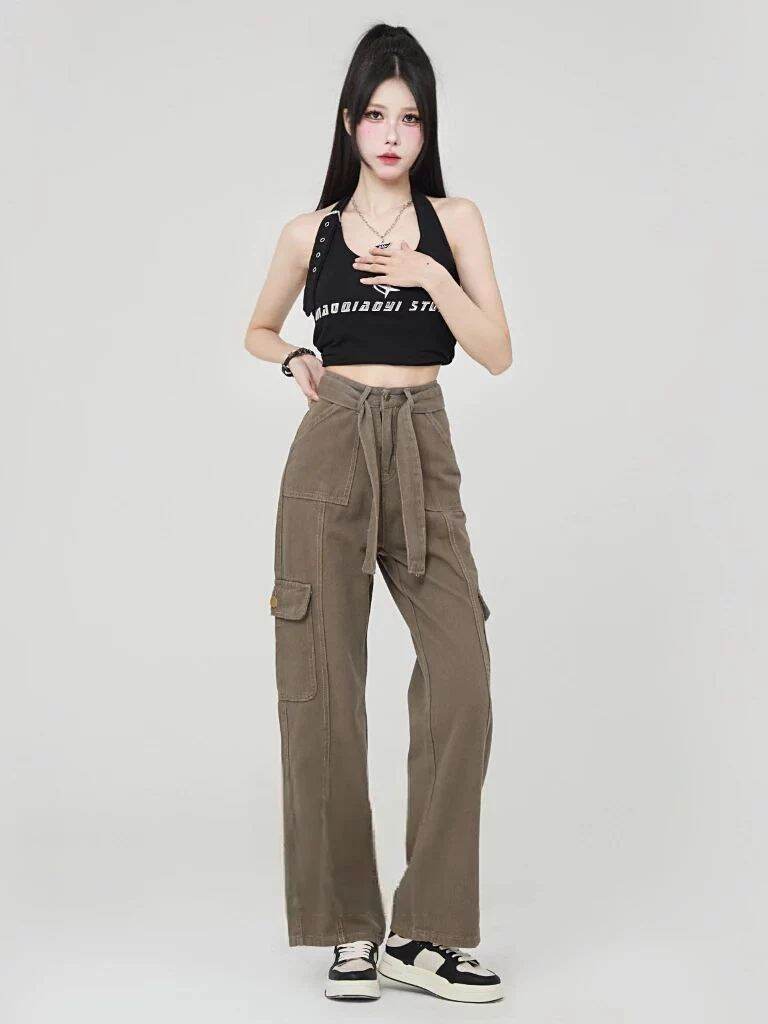 (Gratis Ongkir) Celana Jeans Cargo HW Wanita Super Premium J41-Variasi Pinggang Ikat Tali Depan Jeans Cargo Korean
