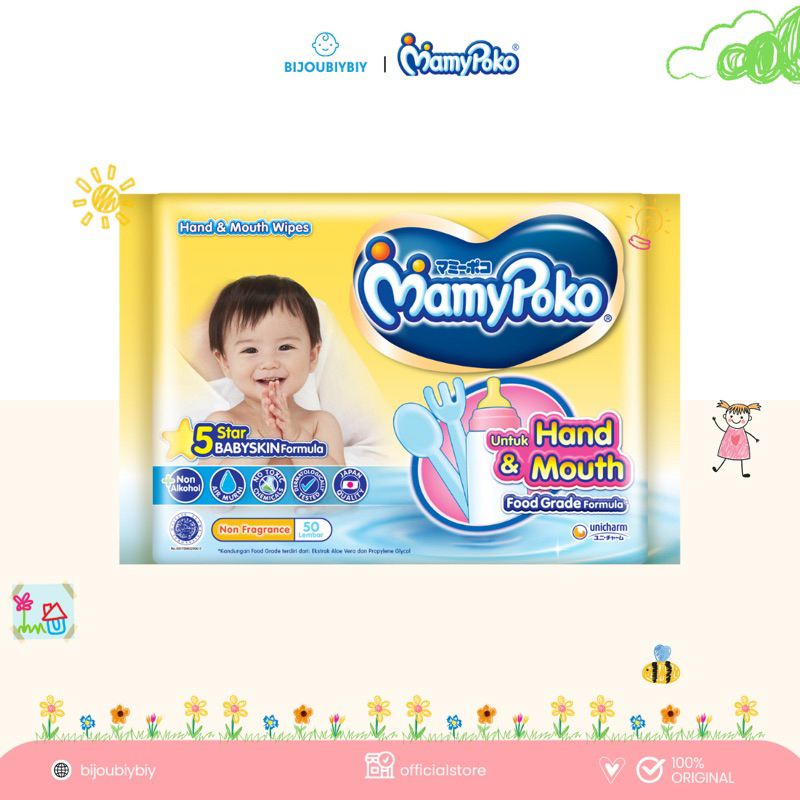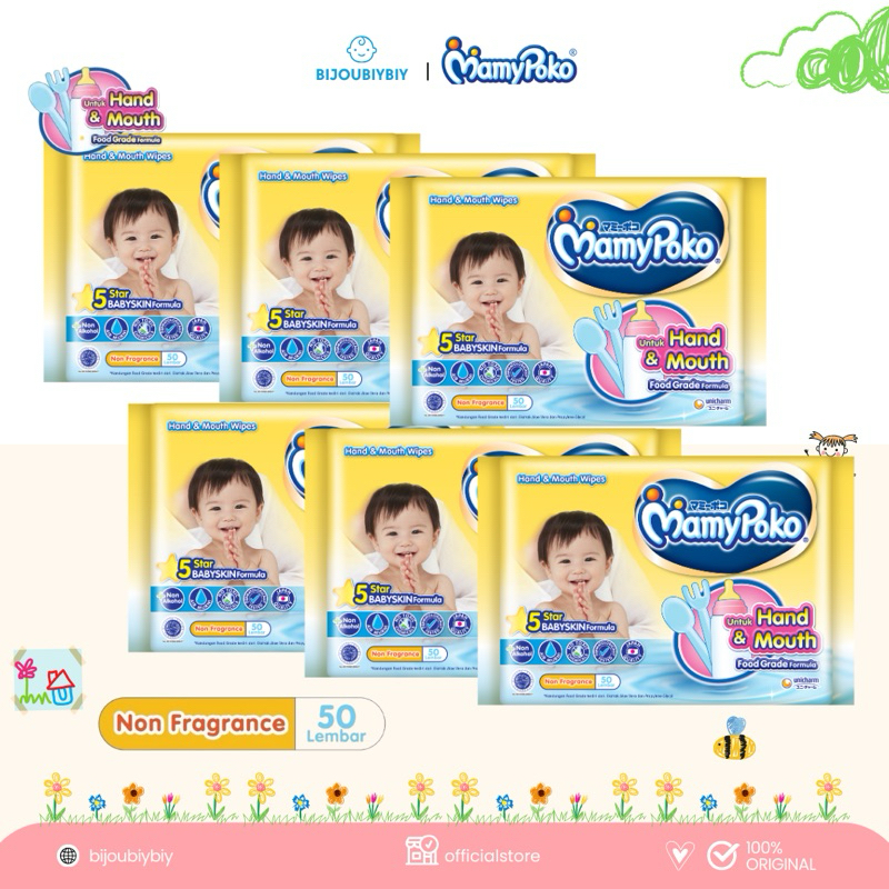 Paket Isi 6 Pcs MamyPoko Hand & Mouth Baby Wipes (Food Grade) (50 Sheet x 6 Pack)