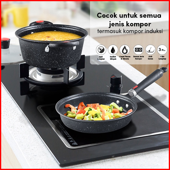 Antilengket Peralatan Masak 3pcs Peralatan Dapur Cocok Untuk Semua Kompor Wajan Panci Paket Keluarga Set