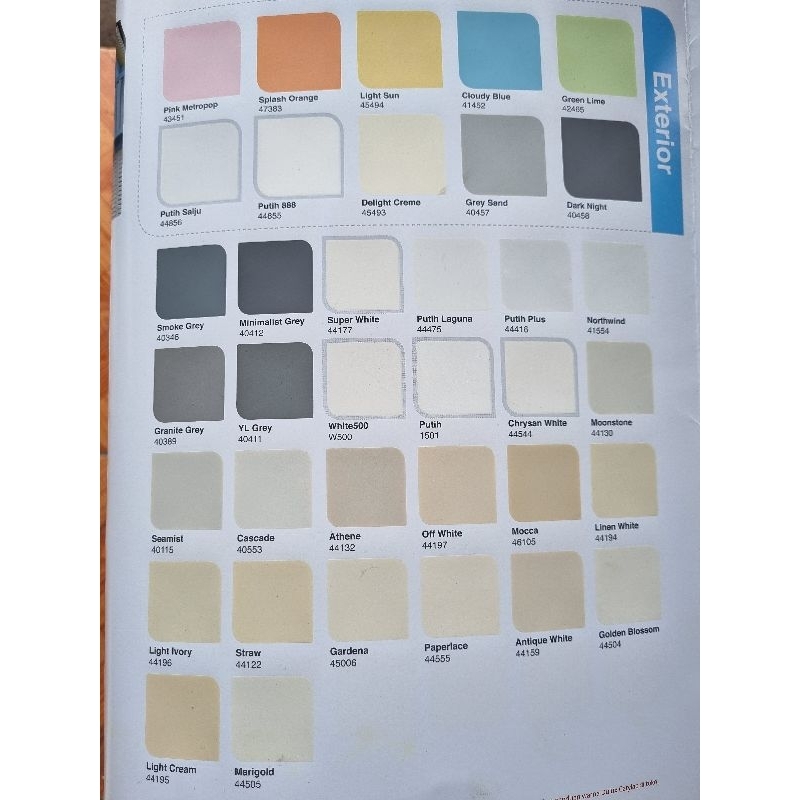 Putih 888, White500, Putih Plus, Chrysan White, Moonstone, Light Ivory, Straw, Paperlace , Golden blossom , Light Cream, Cloudy Blue , Venice Blue , Lime , Off White, Mocca , Blue Anchor , Pingky , Dreamland, Teardrop , Seamist , Cascade , Gardena, Antique White , Marigold, Grey Sand, Pink Metropop , Athene , Putih Salju , Rosy Pink, Delight Creme , Window Garden , Sensational Mood, Tranquil Blue , Jade Green , Pink Snow, Ivory Sparkle , Super White , Ice Blue, Cat Dasar Interior , Hilarious Hessian, Brilliant White 2290 , Sky High Blue , Clean Apricot, After The Rain , Ivory Beige , Unicorn White, Yucca White , Purest Frost , Shy Violet, Avocado White , Eloquent Ivory