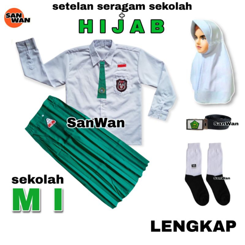 SETELAN SERAGAM SEKOLAH MI PEREMPUAN LENGKAP SET HIJAB KERUDUNG BAJU ROK PANJANG