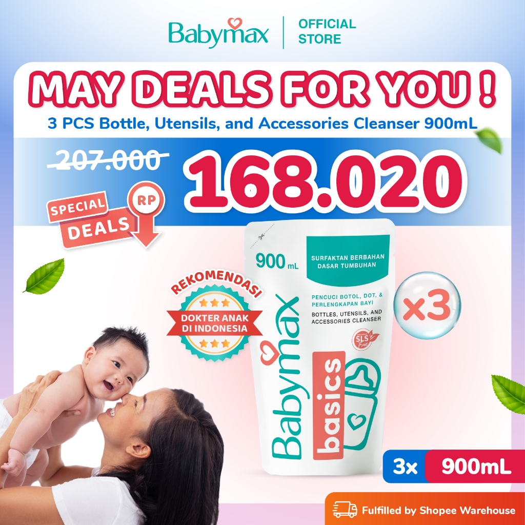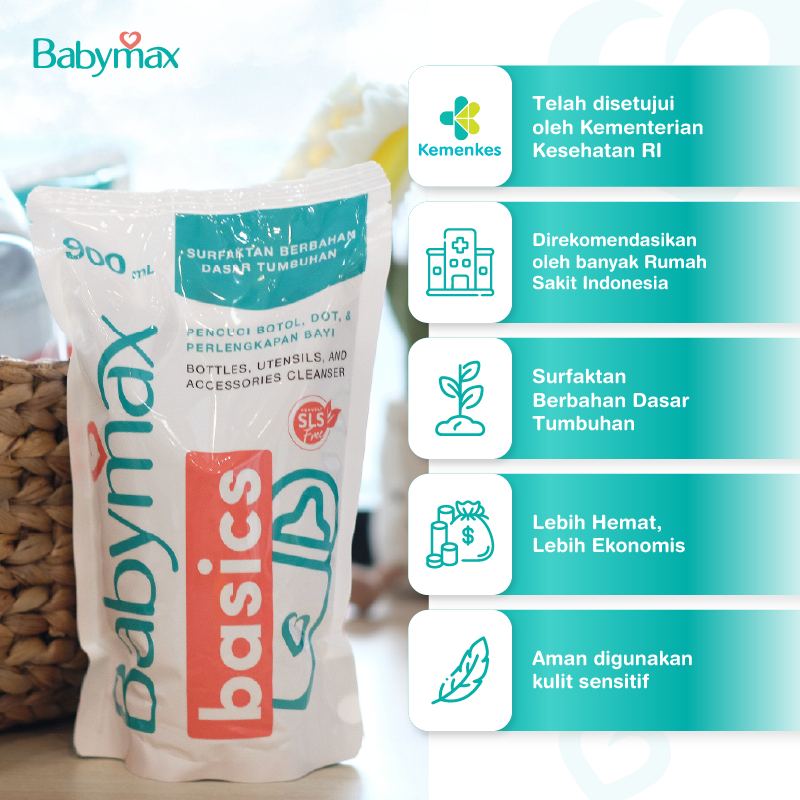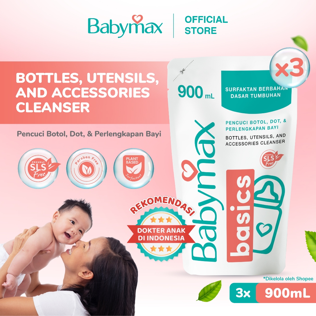 Babymax Basics Bottle, & Utensils, Cleansers 900 mL (isi 3 pcs) - Sabun Botol Bayi - SLS Free - Natural, Surfaktan Berba