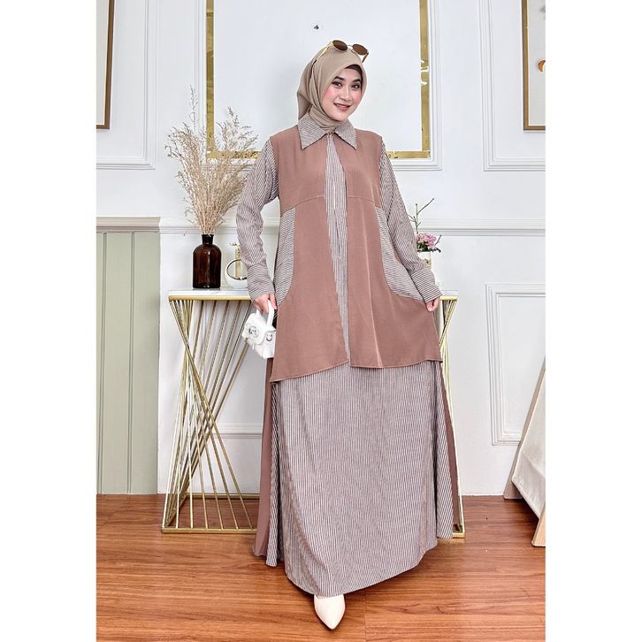 Amie X Poppy Salsabilla Dress Muslim Korean Style Gamis Polos Kombinasi Stripe Size M XL XXL Jumbo