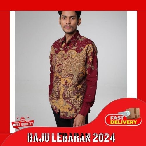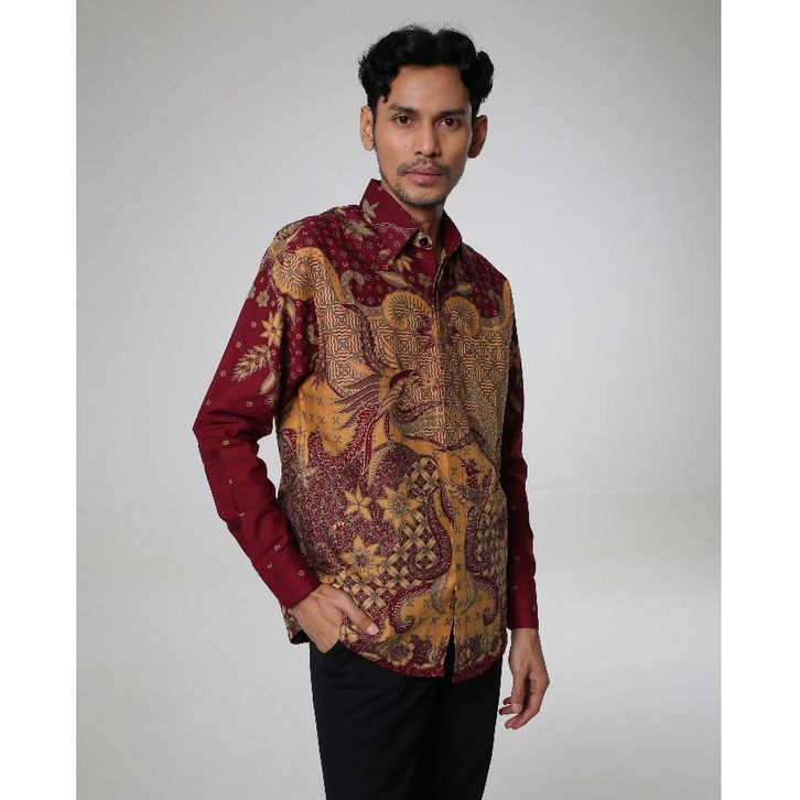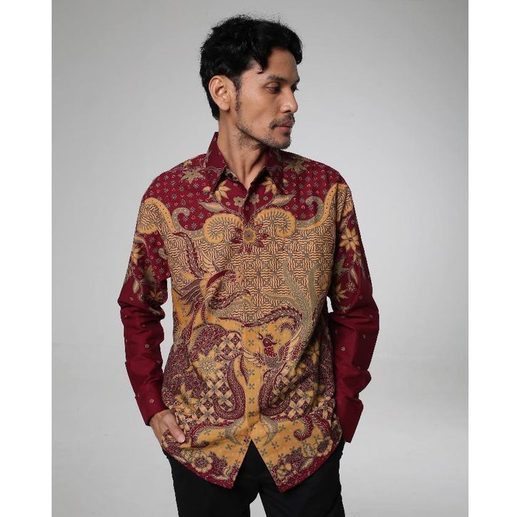 Batik Kembar Baju Batik Pria Motif Nagari Merah Kain Katun Printing Lengan Panjang Lapisan Furing