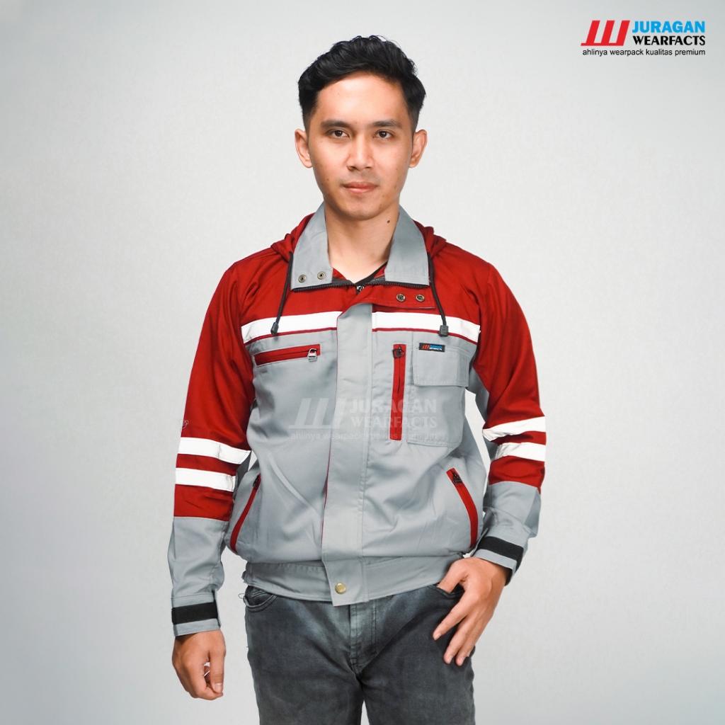 Juragan Wearfacts - Wearpack Kerja Segala Cuaca Warna Merah Maroon Kombinasi Abu