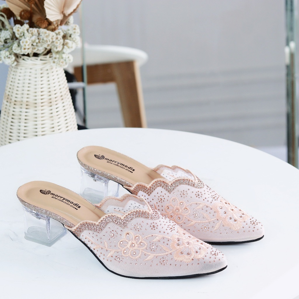 selop pengantin Sandal Heels Pesta Hak Kaca Wanita 5 Cm Selop Mewah