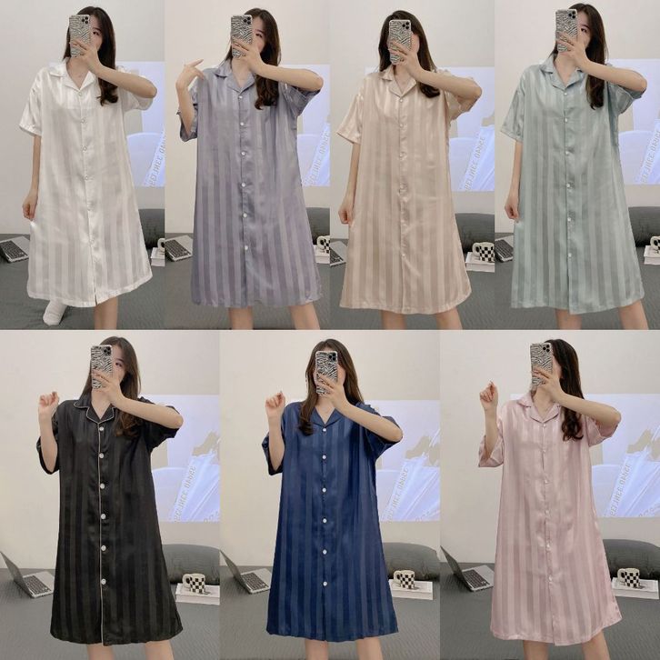 Kyara Dress Sleepwear Daster Tidur Satin Silk Piyama Wanita Lengan Pendek Motif Garis Polos Fashion Korea Kasual