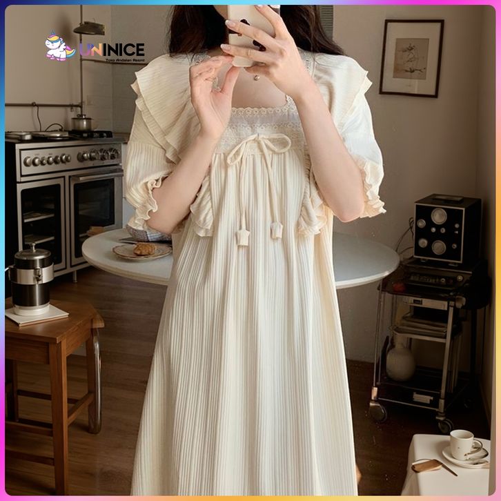 UNINICE Baju Tidur Lengan Pendek Longgar Panjang Sedang Piyama Dress Berenda Manis