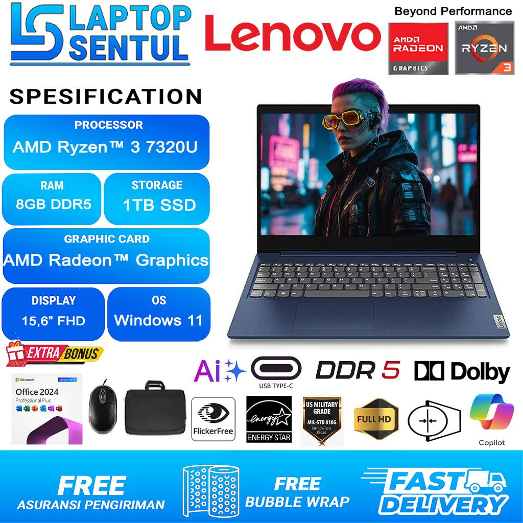 LAPTOP LENOVO IDEAPAD AMD RYZEN 3 7320U 1TB SSD FHD WINDOWS 11 OFFICE 2024 BLUE