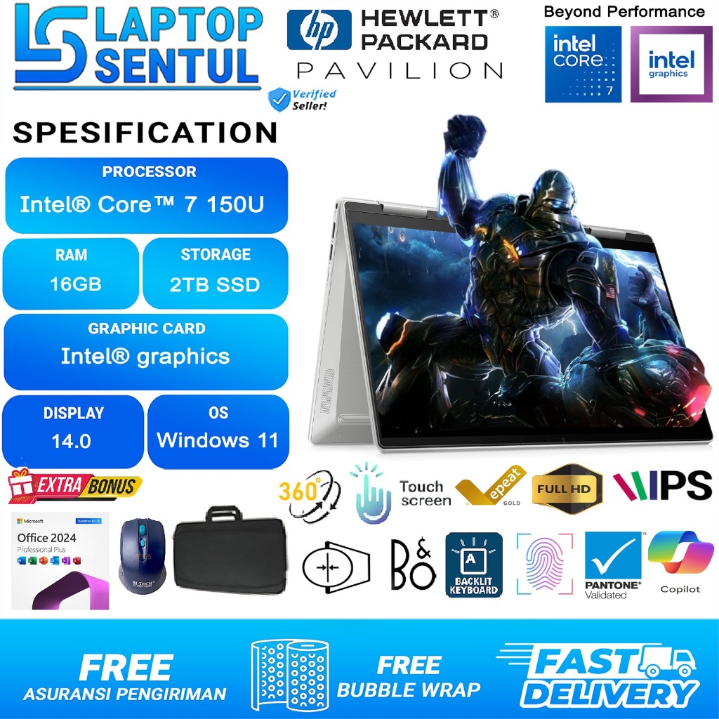 LAPTOP 2IN1 HP PAVILION X360 INTEL CORE 7 150U RAM 16GB 2TB SSD FHD IPS TOUCHSCREEN WINDOWS 11 OFFICE SILVER